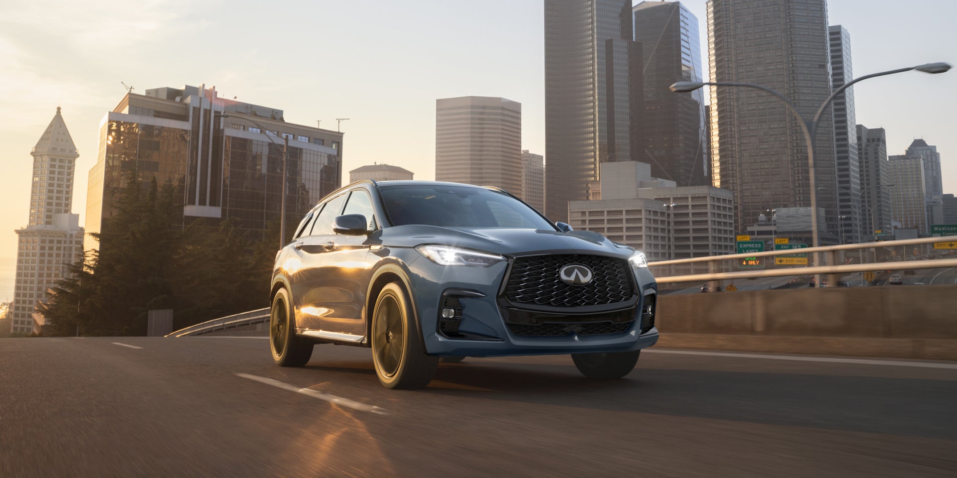 Chiseled lines and deeply sculpted surfaces give QX50 a feeling of fluid power. They also direct airflow, bringing additional stability to high speeds and strong crosswinds.