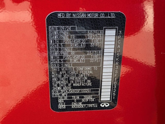 Odometer is 13719 miles below market average! 22/28 City/Highway MPG What makes us different? We specialize in hand selecting our pre-owned inventory and providing an amazing array of vehicles on our lot here in Wilmington, NC. We keep about 1000+ cars on the lot at any given time and find that being priced aggressively upfront allows us to save time, complete the deal process and keep the best inventory possible. The price you see is our very best price! All of our vehicles are priced below market value. We provide a hassle-free buying experience. 16 Speakers, 4-Wheel Disc Brakes, ABS brakes, Air Conditioning, Alloy wheels, AM/FM radio: SiriusXM, Auto High-beam Headlights, Auto tilt-away steering wheel, Auto-dimming Rear-View mirror, Automatic temperature control, Black Splash Guards (Set of 4), Brake assist, Bumpers: body-color, Carpeted Floor Mats, CD player, Climate Controlled Front Bucket Seats, Delay-off headlights, Driver door bin, Driver vanity mirror, Dual front impact airbags, Dual front side impact airbags, Electronic Stability Control, Emergency communication system: INFINITI InTouch, Exclusive Paint, Exterior Parking Camera Rear, Four wheel independent suspension, Front anti-roll bar, Front Bucket Seats, Front Center Armrest, Front dual zone A/C, Front fog lights, Front reading lights, Garage door transmitter, Heated door mirrors, Heated front seats, Heated steering wheel, Illuminated entry, Illuminated Kick Plates, Knee airbag, Leather Shift Knob, Leather steering wheel, Leather-Appointed Seat Trim, Literature Kit, Low tire pressure warning, Memory seat, Navigation system: INFINITI InTouch Navigation, Occupant sensing airbag, Outside temperature display, Overhead airbag, Overhead console, Panic alarm, Passenger door bin, Passenger vanity mirror, Power door mirrors, Power driver seat, Power Liftgate, Power moonroof, Power passenger seat, Power steering, Power windows, Radio data system, Radio: Bose Performance Series Premium Audio, Rain sensing wipers, Rear anti-roll bar, Rear reading lights, Rear seat center armrest, Rear side impact airbag, Rear window defroster, Rear window wiper, Remote keyless entry, Security system, Speed control, Speed-sensing steering, Speed-Sensitive Wipers, Split folding rear seat, Spoiler, Steering wheel memory, Steering wheel mounted audio controls, Tachometer, Telescoping steering wheel, Tilt steering wheel, Traction control, Trip computer, Turn signal indicator mirrors, Variably intermittent wipers, Ventilated front seats, and Wheels: 8.5J x 20 Machine Finished Aluminum Alloy.