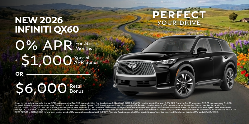 Prices do not include tax, title, license, $799 documentation fee, $99 electronic filing fee. Available on 2026 QX60 PURE & LUXE in retailer stock. Example: 0.0% APR financing for 36 months at $27.78 per month per $1,000 financed. Actual down payment may vary. Subject to residency restrictions. Subject to IFS credit approval. Not all buyers qualify. Retailer contribution may affect actual price set by retailer. Contact retailer for details. Ends 05/04/2026. 2026 QX60 SPORT & AUTOGRAPH Special APR Bonus of $1,000 available towards the retail purchase when financed through INFINITI Financial Services at the IFS Special APR rate. QX60 APR Bonus valid through 05/04/2026. Subject to IFS credit approval and residency restrictions. Must take delivery from new Retailer stock. See your local Retailer for details. $6,000 Retail Bonus available to customers who purchase a new 2026 QX60 SPORT / AUTOGRAPH trims from retailer stock. Offer cannot be combined with INFINITI Financial Services special APR or special lease offers. See your local Retailer for details. Offer ends 05/04/2026.