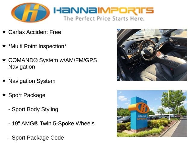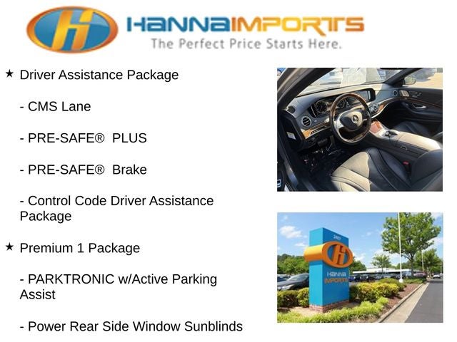 Why shop with Hanna Imports? We specialize in hand-selecting top-quality used cars, trucks, and SUVs for drivers across Raleigh, Durham, Cary, Chapel Hill, and the greater Triangle area of North Carolina. Our massive selection of 1,000+ vehicles on our Raleigh lot is carefully curated to include the most sought-after models, all priced below market value. We believe in transparency and efficiency—our vehicles are aggressively priced from the start, which means no haggling, no hassle, and no wasted time. The price you see is our absolute best price. Whether you're coming from Wake Forest, Apex, Garner, or anywhere in central NC, we’re committed to making your car-buying experience smooth, affordable, and enjoyable. Come see why Hanna Imports is one of the most trusted used car dealerships in North Carolina! Used Mercedes-Benz S-Class in Raleigh. Used Mercedes-Benz S-Class in North Carolina, Control Code Driver Assistance Package, Control Code Premium 1 Package, Driver Assistance Package (Active Blind Spot Assist, Active Lane Keeping Assist, BAS PLUS, CMS Lane, CMS Rear, DISTRONIC PLUS®, DISTRONIC PLUS® w/Steering Assist, PRE-SAFE® Brake, and PRE-SAFE® PLUS), Premium 1 Package (Active Multi-Contour Seats w/Massage, Front Heated Seats - PLUS, Hands-Free Access, Heated & Active Ventilated Front Seats, KEYLESS GO®, PARKTRONIC w/Active Parking Assist, and Power Rear Side Window Sunblinds), Sport Package (19 AMG® Twin 5-Spoke Wheels and Sport Body Styling), Sport Package Code, Black w/Leather Upholstery, COMAND® System w/AM/FM/GPS Navigation, Navigation System, Power moonroof: Panorama, 13 Speakers, 18 10-Spoke Wheels, 4-Wheel Disc Brakes, ABS brakes, Adaptive suspension, Air Conditioning, Alloy wheels, AM/FM radio: SiriusXM, Anti-whiplash front head restraints, Auto High-beam Headlights, Auto tilt-away steering wheel, Auto-dimming door mirrors, Auto-dimming Rear-View mirror, Auto-leveling suspension, Automatic temperature control, Brake assist, Bumpers: body-color, CD player, Child-Seat-Sensing Airbag, Compass, Delay-off headlights, Door auto-latch, Driver door bin, Driver vanity mirror, Dual front impact airbags, Dual front side impact airbags, DVD-Audio, Electronic Stability Control, Emergency communication system: mbrace2, Exterior Parking Camera Rear, Four wheel independent suspension, Front anti-roll bar, Front Bucket Seats, Front Center Armrest, Front dual zone A/C, Front reading lights, Garage door transmitter: Homelink, Genuine wood console insert, Genuine wood door panel insert, Head restraints memory, Heated door mirrors, Heated front seats, Heated Power Front Seats w/Memory, HVAC memory, Illuminated entry, Knee airbag, Leather steering wheel, Leather Upholstery, Low tire pressure warning, Memory seat, Occupant sensing airbag, Outside temperature display, Overhead airbag, Overhead console, Panic alarm, Passenger door bin, Passenger vanity mirror, Power adjustable front head restraints, Power adjustable rear head restraints, Power door mirrors, Power driver seat, Power passenger seat, Power steering, Power windows, Premium audio system: COMAND®,