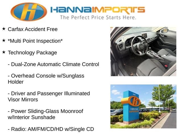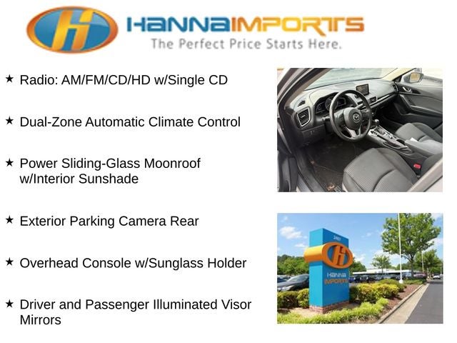 Why shop with Hanna Imports? We specialize in hand-selecting top-quality used cars, trucks, and SUVs for drivers across Raleigh, Durham, Cary, Chapel Hill, and the greater Triangle area of North Carolina. Our massive selection of 1,000+ vehicles on our Raleigh lot is carefully curated to include the most sought-after models, all priced below market value. We believe in transparency and efficiency—our vehicles are aggressively priced from the start, which means no haggling, no hassle, and no wasted time. The price you see is our absolute best price. Whether you're coming from Wake Forest, Apex, Garner, or anywhere in central NC, we’re committed to making your car-buying experience smooth, affordable, and enjoyable. Come see why Hanna Imports is one of the most trusted used car dealerships in North Carolina! Used Mazda Mazda3 in Raleigh. Used Mazda Mazda3 in North Carolina, Technology Package (Driver and Passenger Illuminated Visor Mirrors, Dual-Zone Automatic Climate Control, Overhead Console w/Sunglass Holder, Power Sliding-Glass Moonroof w/Interior Sunshade, Radio: AM/FM/CD/HD w/Single CD, MAZDA CONNECT Infotainment System, and SIRIUS XM Satellite Radio), Mazda3 i Touring, Exterior Parking Camera Rear, 16 x 6.5J Alloy Wheels, 4-Wheel Disc Brakes, 6 Speakers, ABS brakes, Air Conditioning, Alloy wheels, AM/FM radio, Brake assist, Bumpers: body-color, Driver door bin, Driver vanity mirror, Dual front impact airbags, Dual front side impact airbags, Electronic Stability Control, Four wheel independent suspension, Front anti-roll bar, Front Bucket Seats, Front Center Armrest, Front fog lights, Front reading lights, Heated door mirrors, Illuminated entry, Leather Shift Knob, Low tire pressure warning, Occupant sensing airbag, Outside temperature display, Overhead airbag, Panic alarm, Passenger door bin, Passenger vanity mirror, Power door mirrors, Power steering, Power windows, Premium Cloth Seat Trim, Radio data system, Radio: AM/FM/HD Audio System, Rear anti-roll bar, Rear seat center armrest, Rear window defroster, Reclining Front Bucket Seats, Remote keyless entry, Speed control, Speed-sensing steering, Split folding rear seat, Spoiler, Steering wheel mounted audio controls, Tachometer, Telescoping steering wheel, Tilt steering wheel, Traction control, Trip computer, Turn signal indicator mirrors, and Variably intermittent wipers.