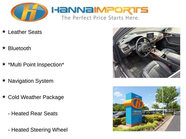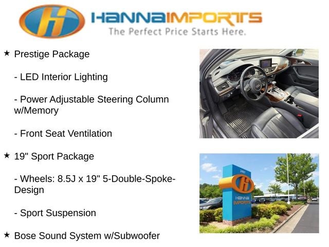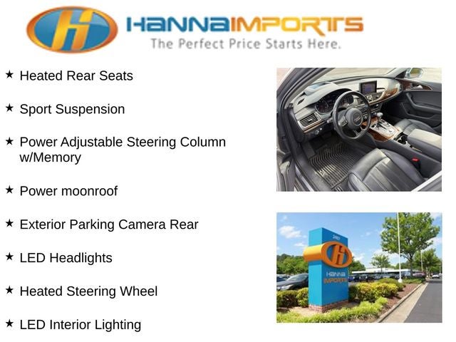 Why shop with Hanna Imports? We specialize in hand-selecting top-quality used cars, trucks, and SUVs for drivers across Raleigh, Durham, Cary, Chapel Hill, and the greater Triangle area of North Carolina. Our massive selection of 1,000+ vehicles on our Raleigh lot is carefully curated to include the most sought-after models, all priced below market value. We believe in transparency and efficiency—our vehicles are aggressively priced from the start, which means no haggling, no hassle, and no wasted time. The price you see is our absolute best price. Whether you're coming from Wake Forest, Apex, Garner, or anywhere in central NC, we’re committed to making your car-buying experience smooth, affordable, and enjoyable. Come see why Hanna Imports is one of the most trusted used car dealerships in North Carolina! Used Audi A6 in Raleigh. Used Audi A6 in North Carolina, 19 Sport Package (Sport Suspension and Wheels: 8.5J x 19 5-Double-Spoke-Design), Cold Weather Package (Heated Rear Seats and Heated Steering Wheel), Prestige Package (Bose Sound System w/Subwoofer, Front Seat Ventilation, Heads-Up Display, LED Headlights, LED Interior Lighting, and Power Adjustable Steering Column w/Memory), Warm Weather Package (Power Rear Window & Rear Side Window Sunshades and 4-Zone Climate Control), A6 3.0T Prestige quattro, quattro, Black Leather, Exterior Parking Camera Rear, Navigation System, Power moonroof, 10 Speakers, 4-Wheel Disc Brakes, ABS brakes, Air Conditioning, Alloy wheels, AM/FM radio: SiriusXM, Anti-whiplash front head restraints, Audi Guard All-Weather Floor Mats (Set of 4), Audi Guard Cargo Mat, Auto-dimming door mirrors, Auto-dimming Rear-View mirror, Automatic temperature control, Brake assist, Bumpers: body-color, Cargo Net, CD player, Compass, Delay-off headlights, Driver door bin, Driver vanity mirror, Dual front impact airbags, Dual front side impact airbags, DVD-Audio, Electronic Stability Control, Four wheel independent suspension, Front anti-roll bar, Front Bucket Seats, Front Center Armrest w/Storage, Front dual zone A/C, Front fog lights, Front reading lights, Garage door transmitter: HomeLink, Genuine wood console insert, Genuine wood dashboard insert, Genuine wood door panel insert, Heated Comfort Front Seats, Heated door mirrors, Heated front seats, High intensity discharge headlights: Xenon plus, HVAC memory, Illuminated entry, Knee airbag, Leather Seating Surfaces, Leather steering wheel, Low tire pressure warning, Memory seat, Occupant sensing airbag, Outside temperature display, Overhead airbag, Panic alarm, Passenger door bin, Passenger vanity mirror, Power door mirrors, Power driver seat, Power passenger seat, Power steering, Power windows, Radio data system, Radio: Multi Media Interface (MMI) Navigation Plus, Rain sensing wipers, Rear air conditioning, Rear anti-roll bar, Rear fog lights, Rear reading lights, Rear seat center armrest, Rear window defroster, Remote keyless entry, Security system, Speed control, Speed-sensing steering, Speed-Sensitive Wipers, Split folding rear seat, Steering wheel mounted audio controls, Tachometer, Telescoping steering wheel, Tilt steering wheel, Traction control, Trip computer, Turn signal indicator mirrors, Variably intermittent wipers, and Wheels: 8.0J x 18 5-V-Spoke Design.