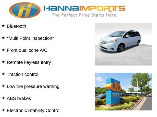 Why shop with Hanna Imports? We specialize in hand-selecting top-quality used cars, trucks, and SUVs for drivers across Raleigh, Durham, Cary, Chapel Hill, and the greater Triangle area of North Carolina. Our massive selection of 1,000+ vehicles on our Raleigh lot is carefully curated to include the most sought-after models, all priced below market value. We believe in transparency and efficiency—our vehicles are aggressively priced from the start, which means no haggling, no hassle, and no wasted time. The price you see is our absolute best price. Whether you're coming from Wake Forest, Apex, Garner, or anywhere in central NC, we’re committed to making your car-buying experience smooth, affordable, and enjoyable. Come see why Hanna Imports is one of the most trusted used car dealerships in North Carolina! Used Toyota Sienna in Raleigh. Used Toyota Sienna in North Carolina, Sienna LE 8 Passenger, ABS brakes, Alloy wheels, Bumpers: body-color, Compass, Electronic Stability Control, Exterior Parking Camera Rear, Front dual zone A/C, Heated door mirrors, Illuminated entry, Low tire pressure warning, Power door mirrors, Remote keyless entry, Roof rack: rails only, Spoiler, Traction control, 17 x 7 5-Spoke Alloy Wheels, 3rd row seats: split-bench, 4-Wheel Disc Brakes, 6 Speakers, Air Conditioning, AM/FM radio: SiriusXM, Auto-dimming Rear-View mirror, Automatic temperature control, Axle Ratio: 3.94, Brake assist, CD player, Delay-off headlights, Door auto-latch, Driver door bin, Driver vanity mirror, Driver's Seat Mounted Armrest, Dual front impact airbags, Dual front side impact airbags, Fabric Seat Material, Front anti-roll bar, Front Bucket Seats, Front reading lights, Front wheel independent suspension, Fully automatic headlights, Garage door transmitter: HomeLink, Knee airbag, Occupant sensing airbag, Outside temperature display, Overhead airbag, Overhead console, Panic alarm, Passenger door bin, Passenger seat mounted armrest, Passenger vanity mirror, Power driver seat, Power steering, Power windows, Radio data system, Radio: AM/FM/HD/CD w/6 Speakers, Rear air conditioning, Rear anti-roll bar, Rear reading lights, Rear window defroster, Rear window wiper, Reclining 3rd row seat, Speed control, Speed-sensing steering, Split folding rear seat, Steering wheel mounted audio controls, Tachometer, Telescoping steering wheel, Tilt steering wheel, Trip computer, and Variably intermittent wipers.