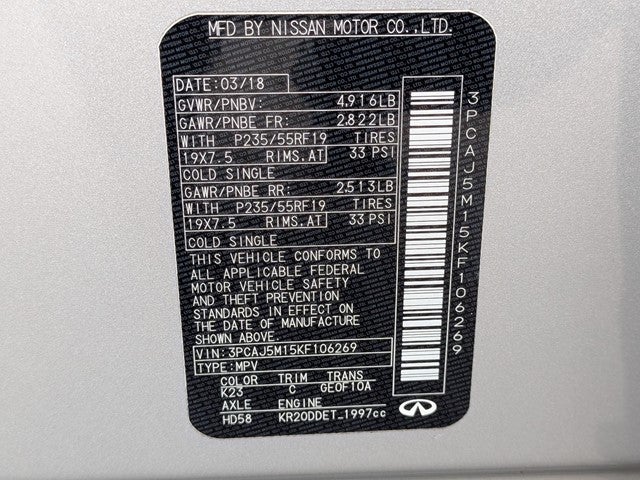 Odometer is 2995 miles below market average! 24/31 City/Highway MPG What makes us different? We specialize in hand selecting our pre-owned inventory and providing an amazing array of vehicles on our lot here in Wilmington, NC. We keep about 1000+ cars on the lot at any given time and find that being priced aggressively upfront allows us to save time, complete the deal process and keep the best inventory possible. The price you see is our very best price! All of our vehicles are priced below market value. We provide a hassle-free buying experience. Cargo Package, Premium Audio Package (Bose 16-Speaker Premium Audio System), Premium Heat Package (Heated Front Seats, Heated Steering Wheel, Memory Seats, Power Tilt & Telescopic Steering Wheel, and Reverse Synchronization Mirrors), ProASSIST Package (Back-Up Collision Intervention (BCI), Distance Control Assist, Intelligent Cruise Control, and Rear Cross Traffic Alert), 4-Wheel Disc Brakes, 5.846 Axle Ratio, 6 Speakers, ABS brakes, Activation Disclaimer, Air Conditioning, Alloy wheels, AM/FM radio: SiriusXM, AM/FM/CD Audio System, Anti-whiplash front head restraints, Auto-dimming Rear-View mirror, Automatic temperature control, Brake assist, Bumpers: body-color, CD player, Delay-off headlights, Driver door bin, Driver vanity mirror, Dual front impact airbags, Dual front side impact airbags, Electronic Stability Control, Emergency communication system: INFINITI Connection, Exterior Parking Camera Rear, Floor Mats, Four wheel independent suspension, Front anti-roll bar, Front Bucket Seats, Front Center Armrest, Front dual zone A/C, Front fog lights, Front reading lights, Garage door transmitter: HomeLink, Heated door mirrors, Illuminated entry, Illuminated Kick Plates, Knee airbag, Leather Shift Knob, Literature Kit, Low tire pressure warning, Navigation system: INFINITI InTouch Navigation, Occupant sensing airbag, Outside temperature display, Overhead airbag, Overhead console, Panic alarm, Passenger door bin, Passenger vanity mirror, Power door mirrors, Power driver seat, Power Liftgate, Power moonroof, Power passenger seat, Power steering, Power windows, Radio data system, Rain sensing wipers, Rear air conditioning, Rear anti-roll bar, Rear reading lights, Rear seat center armrest, Rear window defroster, Rear window wiper, Remote keyless entry, Roof rack: rails only, Security system, Speed control, Speed-sensing steering, Speed-Sensitive Wipers, Splash Guards (Set of 4), Split folding rear seat, Spoiler, Standard Leather Seat Trim, Steering wheel mounted audio controls, Tachometer, Telescoping steering wheel, Tilt steering wheel, Traction control, Trip computer, Turn signal indicator mirrors, Variably intermittent wipers, Welcome Lighting, and Wheels: 19 x 7.5J Silver Painted Aluminum Alloy.