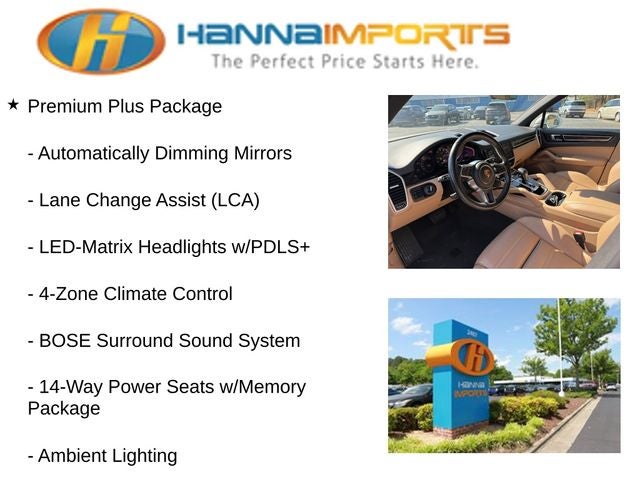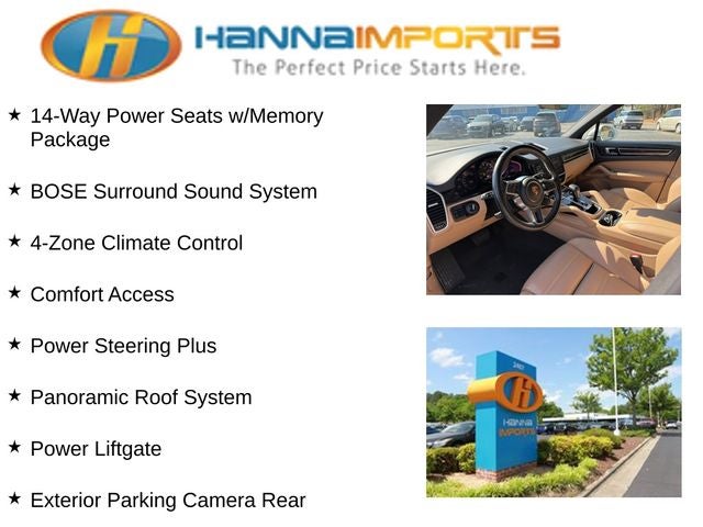 Why shop with Hanna Imports? We specialize in hand-selecting top-quality used cars, trucks, and SUVs for drivers across Raleigh, Durham, Cary, Chapel Hill, and the greater Triangle area of North Carolina. Our massive selection of 1,000+ vehicles on our Raleigh lot is carefully curated to include the most sought-after models, all priced below market value. We believe in transparency and efficiency—our vehicles are aggressively priced from the start, which means no haggling, no hassle, and no wasted time. The price you see is our absolute best price. Whether you're coming from Wake Forest, Apex, Garner, or anywhere in central NC, we’re committed to making your car-buying experience smooth, affordable, and enjoyable. Come see why Hanna Imports is one of the most trusted used car dealerships in North Carolina! Used Porsche Cayenne E-Hybrid in Raleigh. Used Porsche Cayenne E-Hybrid in North Carolina, 14-Way Power Seats w/Memory Package, Premium Plus Package (4-Zone Climate Control, Ambient Lighting, Automatically Dimming Mirrors, BOSE Surround Sound System, Comfort Access, Front and Rear Seat Heating, Front Seat Ventilation, Lane Change Assist (LCA), LED-Matrix Headlights w/PDLS+, Panoramic Roof System, and Power Steering Plus), Electric Motor, Apple CarPlay, Exterior Parking Camera Rear, Navigation system: Porsche Communication Management (PCM), Power Liftgate, Wheels: 21 RS Spyder Design, 10 Speakers, 4-Wheel Disc Brakes, 8-Way Power Seats, ABS brakes, Adaptive suspension, Air Conditioning, Alloy wheels, AM/FM radio: SiriusXM, Automatic temperature control, Axle Ratio: 3.32, Brake assist, Bumpers: body-color, Delay-off headlights, Driver door bin, Driver vanity mirror, Dual front impact airbags, Dual front side impact airbags, Electronic Stability Control, Four wheel independent suspension, Front anti-roll bar, Front Bucket Seats, Front Center Armrest, Front dual zone A/C, Front reading lights, Fully automatic headlights, Garage door transmitter: HomeLink, Heated door mirrors, Illuminated entry, Knee airbag, Leather Shift Knob, Low tire pressure warning, Occupant sensing airbag, Outside temperature display, Overhead airbag, Overhead console, Panic alarm, Partial Leather Seat Trim, Passenger door bin, Passenger vanity mirror, Porsche Communication Management, Power door mirrors, Power driver seat, Power passenger seat, Power steering, Power windows, Radio data system, Rain sensing wipers, Rear anti-roll bar, Rear fog lights, Rear reading lights, Rear seat center armrest, Rear side impact airbag, Rear window defroster, Rear window wiper, Remote keyless entry, Security system, Speed control, Split folding rear seat, Spoiler, Steering wheel mounted audio controls, Tachometer, Telescoping steering wheel, Tilt steering wheel, Traction control, Trip computer, Turn signal indicator mirrors, Variably intermittent wipers, and Voltmeter.