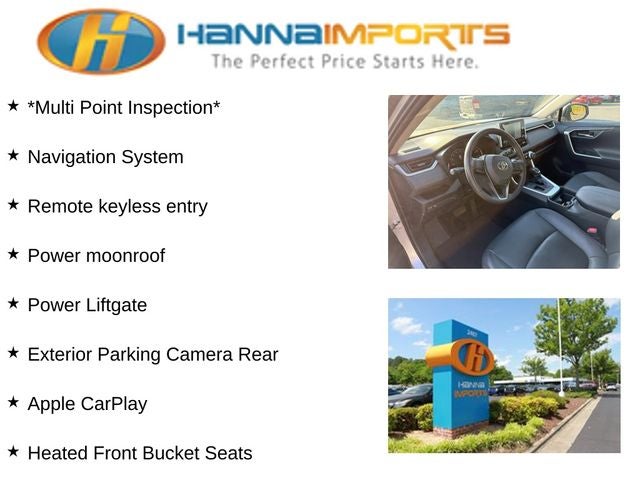 Why shop with Hanna Imports? We specialize in hand-selecting top-quality used cars, trucks, and SUVs for drivers across Raleigh, Durham, Cary, Chapel Hill, and the greater Triangle area of North Carolina. Our massive selection of 1,000+ vehicles on our Raleigh lot is carefully curated to include the most sought-after models, all priced below market value. We believe in transparency and efficiency—our vehicles are aggressively priced from the start, which means no haggling, no hassle, and no wasted time. The price you see is our absolute best price. Whether you're coming from Wake Forest, Apex, Garner, or anywhere in central NC, we’re committed to making your car-buying experience smooth, affordable, and enjoyable. Come see why Hanna Imports is one of the most trusted used car dealerships in North Carolina! Used Toyota RAV4 in Raleigh. Used Toyota RAV4 in North Carolina, Black w/SofTex Seat Trim, Apple CarPlay, Exterior Parking Camera Rear, Heated Front Bucket Seats, Navigation System, Power Liftgate, Power moonroof, Remote keyless entry, 4-Wheel Disc Brakes, 6 Speakers, ABS brakes, Air Conditioning, Alloy wheels, AM/FM radio: SiriusXM, Auto High-beam Headlights, Auto-dimming Rear-View mirror, Automatic temperature control, Axle Ratio: 3.177, Brake assist, Bumpers: body-color, Delay-off headlights, Driver door bin, Driver vanity mirror, Dual front impact airbags, Dual front side impact airbags, Electronic Stability Control, Emergency communication system: Entune Safety Connect, Four wheel independent suspension, Front anti-roll bar, Front Bucket Seats, Front Center Armrest, Front dual zone A/C, Front fog lights, Front reading lights, Fully automatic headlights, Garage door transmitter: HomeLink, Heated door mirrors, Heated front seats, Illuminated entry, Knee airbag, Leather Shift Knob, Low tire pressure warning, Memory seat, Occupant sensing airbag, Outside temperature display, Overhead airbag, Overhead console, Panic alarm, Passenger door bin, Passenger vanity mirror, Power door mirrors, Power driver seat, Power steering, Power windows, Radio data system, Radio: Entune 3.0 Premium Audio, Rear anti-roll bar, Rear seat center armrest, Rear window defroster, Rear window wiper, Roof rack: rails only, Security system, SofTex Seat Trim, Speed control, Speed-sensing steering, Split folding rear seat, Spoiler, Steering wheel mounted audio controls, Tachometer, Telescoping steering wheel, Tilt steering wheel, Traction control, Trip computer, Turn signal indicator mirrors, Variably intermittent wipers, and Wheels: 19 x 7.5J Alloy.