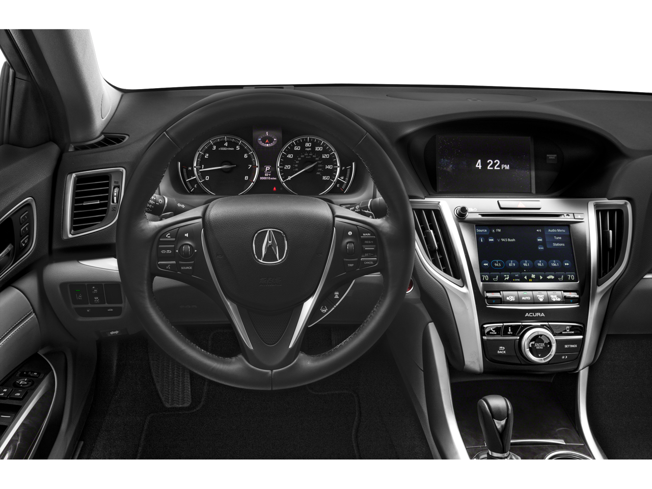 Equipped with 4-Wheel Disc Brakes, 7 Speakers, ABS brakes, Air Conditioning, Alloy wheels, AM/FM radio: SiriusXM, Anti-whiplash front head restraints, Apple CarPlay/Android Auto, Auto High-beam Headlights, Auto-dimming Rear-View mirror, Automatic temperature control, Brake assist, Bumpers: body-color, CD player, Compass, Delay-off headlights, Driver door bin, Driver vanity mirror, Dual front impact airbags, Dual front side impact airbags, Electronic Stability Control, Exterior Parking Camera Rear, Four wheel independent suspension, Front anti-roll bar, Front Bucket Seats, Front Center Armrest w/Storage, Front dual zone A/C, Front reading lights, Garage door transmitter: HomeLink, Heated door mirrors, Heated front seats, Heated Front Sport Seats, HVAC memory, Illuminated entry, Knee airbag, Lane departure: Lane Keeping Assist System (LKAS) active, Leather Shift Knob, Leather steering wheel, Leatherette-Trimmed Interior, Low tire pressure warning, Memory seat, Occupant sensing airbag, Outside temperature display, Overhead airbag, Overhead console, Panic alarm, Passenger door bin, Passenger vanity mirror, Power door mirrors, Power driver seat, Power moonroof, Power passenger seat, Power steering, Power windows, Radio data system, Radio: Acura Premium Audio System, Rear anti-roll bar, Rear reading lights, Rear seat center armrest, Rear window defroster, Remote keyless entry, Security system, Speed control, Speed-sensing steering, Speed-Sensitive Wipers, Split folding rear seat, Steering wheel mounted audio controls, Tachometer, Telescoping steering wheel, Tilt steering wheel, Traction control, Trip computer, Turn signal indicator mirrors, Variably intermittent wipers, and Wheels: 17 x 7.5 Pewter Gray Aluminum Alloy.
