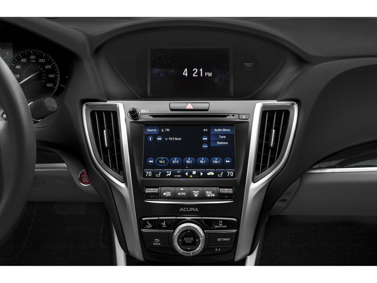 - Radio: Acura Premium Audio System -inc: 7 speakers, SiriusXM satellite radio, Pandora compatibility, USB audio interface w/smartphone integration, Bluetooth® streaming audio, MP3/auxiliary input jack, Speed-sensitive Volume Compensation (SVC), On Demand Multi-Use Display (ODMD) 2.0, Siri Eyes Free (iPhone only), Apple Carplay and Android Auto integration, Bluetooth® HandsFreeLink wireless telephone interface and SMS, MMS text message and email capability