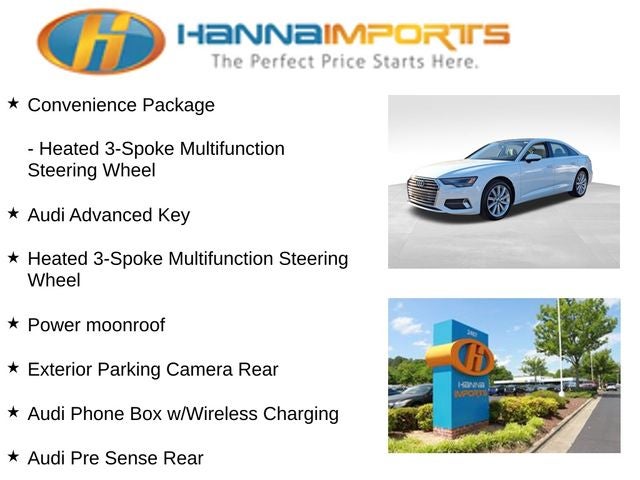 Why shop with Hanna Imports? We specialize in hand-selecting top-quality used cars, trucks, and SUVs for drivers across Raleigh, Durham, Cary, Chapel Hill, and the greater Triangle area of North Carolina. Our massive selection of 1,000+ vehicles on our Raleigh lot is carefully curated to include the most sought-after models, all priced below market value. We believe in transparency and efficiency—our vehicles are aggressively priced from the start, which means no haggling, no hassle, and no wasted time. The price you see is our absolute best price. Whether you're coming from Wake Forest, Apex, Garner, or anywhere in central NC, we’re committed to making your car-buying experience smooth, affordable, and enjoyable. Come see why Hanna Imports is one of the most trusted used car dealerships in North Carolina! Used Audi A6 in Raleigh. Used Audi A6 in North Carolina, Convenience Package (Audi Advanced Key, Audi Phone Box w/Wireless Charging, Audi Pre Sense Rear, Audi Side Assist w/Rear Cross Traffic Assist, and Heated 3-Spoke Multifunction Steering Wheel), A6 2.0T Premium quattro, quattro, Pearl Beige Leather, Exterior Parking Camera Rear, Heated front seats, Navigation System, Power moonroof, 10 Speakers, 4-Wheel Disc Brakes, ABS brakes, Air Conditioning, Alloy wheels, AM/FM radio: SiriusXM, Audi smartphone interface (Apple CarPlay/Android Auto), Auto High-beam Headlights, Auto tilt-away steering wheel, Auto-dimming door mirrors, Auto-dimming Rear-View mirror, Automatic temperature control, Brake assist, Bumpers: body-color, Compass, Delay-off headlights, Driver door bin, Driver vanity mirror, Dual front impact airbags, Dual front side impact airbags, Electronic Stability Control, Emergency communication system: Audi connect CARE, Four wheel independent suspension, Front anti-roll bar, Front Bucket Seats, Front Center Armrest, Front dual zone A/C, Front fog lights, Front reading lights, Garage door transmitter: HomeLink, Genuine wood console insert, Genuine wood dashboard insert, Genuine wood door panel insert, Gray/Brown Fine Grain Ash Natural Wood Inlays, Heated door mirrors, Heated Front Seats, Illuminated entry, Knee airbag, Leather Seating Surfaces, Leather Shift Knob, Low tire pressure warning, Memory seat, Occupant sensing airbag, Outside temperature display, Overhead airbag, Overhead console, Panic alarm, Passenger door bin, Passenger vanity mirror, Power door mirrors, Power driver seat, Power passenger seat, Power steering, Power windows, Radio data system, Radio: Audi MMI Navigation w/MMI Touch Response, Rain sensing wipers, Rear air conditioning, Rear anti-roll bar, Rear reading lights, Rear seat center armrest, Rear window defroster, Remote keyless entry, Security system, Speed control, Speed-sensing steering, Speed-Sensitive Wipers, Split folding rear seat, Steering wheel memory, Steering wheel mounted audio controls, Tachometer, Telescoping steering wheel, Tilt steering wheel, Traction control, Trip computer, Turn signal indicator mirrors, USB Cables, Variably intermittent wipers, and Wheels: 19 10-Spoke-Dynamic Design.
