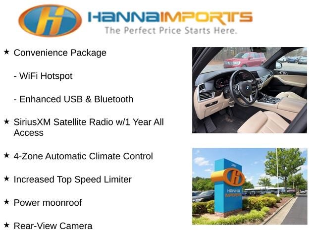 Why shop with Hanna Imports? We specialize in hand-selecting top-quality used cars, trucks, and SUVs for drivers across Raleigh, Durham, Cary, Chapel Hill, and the greater Triangle area of North Carolina. Our massive selection of 1,000+ vehicles on our Raleigh lot is carefully curated to include the most sought-after models, all priced below market value. We believe in transparency and efficiency—our vehicles are aggressively priced from the start, which means no haggling, no hassle, and no wasted time. The price you see is our absolute best price. Whether you're coming from Wake Forest, Apex, Garner, or anywhere in central NC, we’re committed to making your car-buying experience smooth, affordable, and enjoyable. Come see why Hanna Imports is one of the most trusted used car dealerships in North Carolina! Used BMW X5 in Raleigh. Used BMW X5 in North Carolina, Convenience Package (4-Zone Automatic Climate Control, Enhanced USB & Bluetooth®, SiriusXM Satellite Radio w/1 Year All Access, WiFi Hotspot, and Wireless Charging), Canberra Beige/Black Artificial Leather, Exterior Parking Camera Rear, Heated Front Seats, Increased Top Speed Limiter, Navigation System, Power moonroof, Rear-View Camera, Wheels: 21 x 9.5 Fr & 21 x 10.5 Rr Bi-Color, 10 Speakers, 3.39 Axle Ratio, 4-Wheel Disc Brakes, ABS brakes, Air Conditioning, Alloy wheels, AM/FM radio, AM/FM Stereo, Apple CarPlay Compatibility, Auto High-beam Headlights, Auto tilt-away steering wheel, Auto-dimming door mirrors, Auto-dimming Rear-View mirror, Automatic temperature control, Brake assist, Bumpers: body-color, Compass, Delay-off headlights, Driver door bin, Driver vanity mirror, Dual front impact airbags, Dual front side impact airbags, Electronic Stability Control, Emergency communication system: BMW Assist eCall, Four wheel independent suspension, Front anti-roll bar, Front Bucket Seats, Front Center Armrest, Front dual zone A/C, Front fog lights, Front reading lights, Fully automatic headlights, Garage door transmitter, Genuine wood console insert, Genuine wood dashboard insert, Genuine wood door panel insert, Head restraints memory, Heated door mirrors, Heated front seats, Heated Front Seats w/Armrests & Steering Wheel, Hi-Fi Sound System, Illuminated entry, Knee airbag, Leather Shift Knob, Leather steering wheel, Low tire pressure warning, Lumbar Support, Memory seat, Occupant sensing airbag, Outside temperature display, Overhead airbag, Panic alarm, Passenger door bin, Passenger vanity mirror, Power adjustable front head restraints, Power door mirrors, Power driver seat, Power Front Seats, Power passenger seat, Power steering, Power windows, Radio data system, Rain sensing wipers, Rear air conditioning, Rear anti-roll bar, Rear reading lights, Rear seat center armrest, Rear window defroster, Rear window wiper, Remote keyless entry, Roof rack: rails only, Security system, SensaTec Upholstery, Speed control, Speed-sensing steering, Speed-Sensitive Wipers, Split folding rear seat, Spoiler, Sport Seats, Sport steering wheel, Steering wheel memory, Steering wheel mounted audio controls, Tachometer, Telescoping steering wheel, Tilt steering wheel, Traction control, Trip computer, Turn signal indicator mirrors, Variably intermittent wipers, and Wheels: 19 x 9 V-Spoke (Style 734)