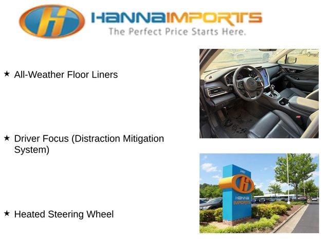 Why shop with Hanna Imports? We specialize in hand-selecting top-quality used cars, trucks, and SUVs for drivers across Raleigh, Durham, Cary, Chapel Hill, and the greater Triangle area of North Carolina. Our massive selection of 1,000+ vehicles on our Raleigh lot is carefully curated to include the most sought-after models, all priced below market value. We believe in transparency and efficiency—our vehicles are aggressively priced from the start, which means no haggling, no hassle, and no wasted time. The price you see is our absolute best price. Whether you're coming from Wake Forest, Apex, Garner, or anywhere in central NC, we’re committed to making your car-buying experience smooth, affordable, and enjoyable. Come see why Hanna Imports is one of the most trusted used car dealerships in North Carolina! Used Subaru Outback in Raleigh. Used Subaru Outback in North Carolina, Popular Package #2 (All-Weather Floor Liners, Auto-Dimming Exterior Mirror w/Approach Light, Dome Light LED Upgrade, Rear Bumper Cover, Rear Seat Back Protector, and Splash Guards), Power Moonroof & HSW & Navigation System (Driver Focus (Distraction Mitigation System), Heated Steering Wheel, Power Moonroof, Radio: Subaru STARLINK 11.6 Multimedia Nav System, and harman/kardon Surround Sound Speaker System), Outback Limited, Exterior Parking Camera Rear, Power Liftgate, 12 Speakers, 3.90 Axle Ratio, 4-Wheel Disc Brakes, ABS brakes, Air Conditioning, Alloy wheels, AM/FM radio: SiriusXM, Auto High-beam Headlights, Auto-dimming Rear-View mirror, Automatic temperature control, Brake assist, Bumpers: body-color, Compass, Driver door bin, Driver vanity mirror, Dual front impact airbags, Dual front side impact airbags, Electronic Stability Control, Emergency communication system: STARLINK Safety and Security (Subscription Required), Four wheel independent suspension, Front anti-roll bar, Front Bucket Seats, Front Center Armrest w/Storage, Front dual zone A/C, Front fog lights, Front reading lights, Fully automatic headlights, Garage door transmitter: HomeLink, harman/kardon® Speakers, Heated door mirrors, Heated Front Bucket Seats w/Memory, Heated front seats, Heated rear seats, Illuminated entry, Knee airbag, Low tire pressure warning, Memory seat, Occupant sensing airbag, Outside temperature display, Overhead airbag, Overhead console, Panic alarm, Passenger door bin, Passenger vanity mirror, Perforated Leather-Trimmed Upholstery, Power door mirrors, Power driver seat, Power passenger seat, Power steering, Power windows, Radio: Subaru STARLINK 11.6 Multimedia Plus Sys, Rear anti-roll bar, Rear seat center armrest, Rear window defroster, Rear window wiper, Remote keyless entry, Roof rack, Security system, Speed control, Speed-sensing steering, Split folding rear seat, Spoiler, STARLINK/Apple CarPlay/Android Auto, Steering wheel mounted audio controls, Steering Wheel Paddle Shift Control Switches, Tachometer, Telescoping steering wheel, Tilt steering wheel, Traction control, Trip computer, Turn signal indicator mirrors, Variably intermittent wipers, and Wheels: 18 x 7J Black Aluminum Alloy.
