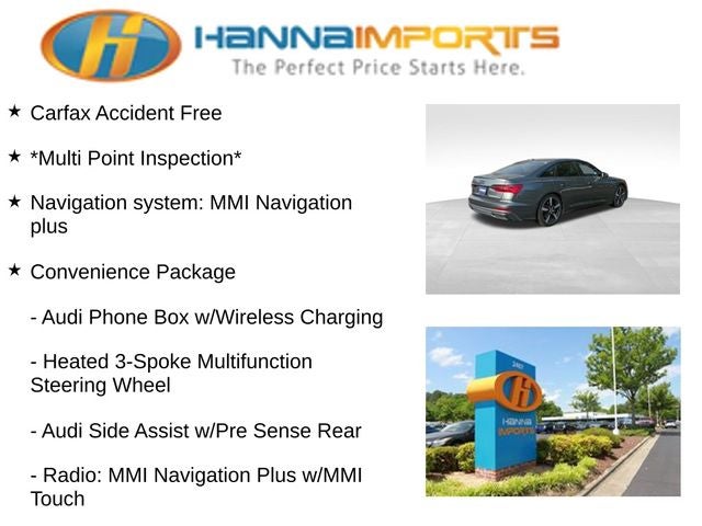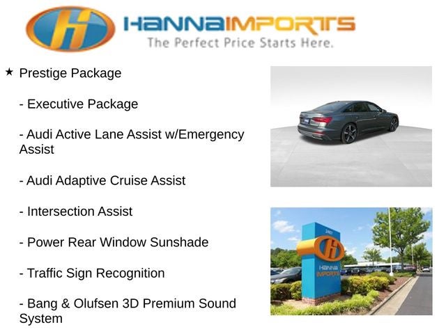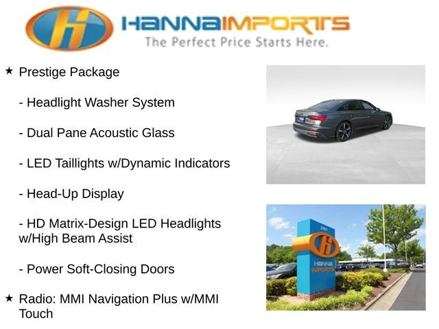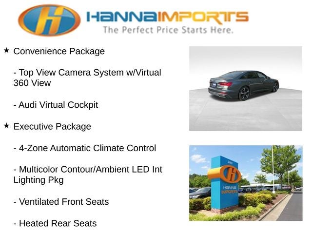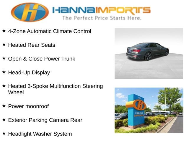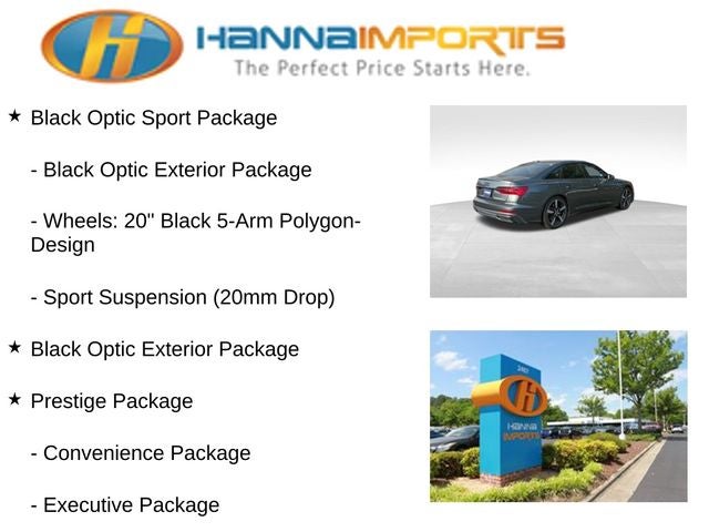 Why shop with Hanna Imports? We specialize in hand-selecting top-quality used cars, trucks, and SUVs for drivers across Raleigh, Durham, Cary, Chapel Hill, and the greater Triangle area of North Carolina. Our massive selection of 1,000+ vehicles on our Raleigh lot is carefully curated to include the most sought-after models, all priced below market value. We believe in transparency and efficiency—our vehicles are aggressively priced from the start, which means no haggling, no hassle, and no wasted time. The price you see is our absolute best price. Whether you're coming from Wake Forest, Apex, Garner, or anywhere in central NC, we’re committed to making your car-buying experience smooth, affordable, and enjoyable. Come see why Hanna Imports is one of the most trusted used car dealerships in North Carolina! Used Audi A6 in Raleigh. Used Audi A6 in North Carolina, Black Optic Exterior Package, Black Optic Sport Package (Sport Suspension (20mm Drop) and Wheels: 20 Black 5-Arm Polygon-Design), Convenience Package (Audi Phone Box w/Wireless Charging, Audi Side Assist w/Pre Sense Rear, Audi Virtual Cockpit, Heated 3-Spoke Multifunction Steering Wheel, Radio: MMI Navigation Plus w/MMI Touch, and Top View Camera System w/Virtual 360 View), Executive Package (4-Zone Automatic Climate Control, Heated Rear Seats, Multicolor Contour/Ambient LED Int Lighting Pkg, Open & Close Power Trunk, and Ventilated Front Seats), Prestige Package (Audi Active Lane Assist w/Emergency Assist, Audi Adaptive Cruise Assist, Bang & Olufsen 3D Premium Sound System, Contrast Stitching on Door Armrests & Knee Bolster, Dual Pane Acoustic Glass, HD Matrix-Design LED Headlights w/High Beam Assist, Head-Up Display, Headlight Washer System, Intersection Assist, LED Taillights w/Dynamic Indicators, Power Rear Window Sunshade, Power Soft-Closing Doors, and Traffic Sign Recognition), A6 3.0T Prestige quattro, quattro, Black Leather, Exterior Parking Camera Rear, Navigation system: MMI Navigation plus, Power moonroof, 10 Speakers, 4-Wheel Disc Brakes, ABS brakes, Air Conditioning, All Weather Floor Mats, Alloy wheels, AM/FM radio: SiriusXM, Audi Black Rings & Badges Kit, Audi smartphone interface (Apple CarPlay/Android Auto), Auto High-beam Headlights, Auto tilt-away steering wheel, Auto-dimming door mirrors, Auto-dimming Rear-View mirror, Automatic temperature control, Brake assist, Bumpers: body-color, Cargo Mat, Cleaning Cloth, Compass, Delay-off headlights, Driver door bin, Driver vanity mirror, Dual front impact airbags, Dual front side impact airbags, Electronic Stability Control, Emergency communication system: Audi connect CARE, Four wheel independent suspension, Front