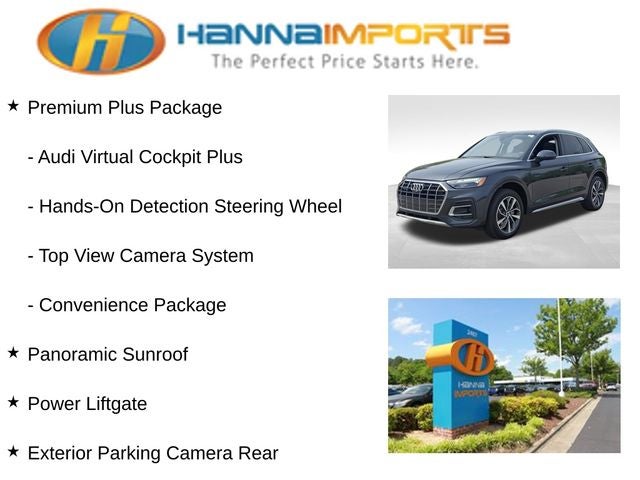 Why shop with Hanna Imports? We specialize in hand-selecting top-quality used cars, trucks, and SUVs for drivers across Raleigh, Durham, Cary, Chapel Hill, and the greater Triangle area of North Carolina. Our massive selection of 1,000+ vehicles on our Raleigh lot is carefully curated to include the most sought-after models, all priced below market value. We believe in transparency and efficiency—our vehicles are aggressively priced from the start, which means no haggling, no hassle, and no wasted time. The price you see is our absolute best price. Whether you're coming from Wake Forest, Apex, Garner, or anywhere in central NC, we’re committed to making your car-buying experience smooth, affordable, and enjoyable. Come see why Hanna Imports is one of the most trusted used car dealerships in North Carolina! Used Audi Q5 in Raleigh. Used Audi Q5 in North Carolina, Convenience Package, Premium Plus Package (Adaptive Cruise Control w/Traffic Jam Assist, Audi Active Lane Assist, Audi Phone Box, Audi Virtual Cockpit Plus, Hands-On Detection Steering Wheel, Leatherette Covered Center Console & Door Armrests, Panoramic Sunroof, Top View Camera System, and Wheels: 19 5-Double-Arm Design Bi-Color Finish), Black w/Leather Seating Surfaces, Exterior Parking Camera Rear, Power Liftgate, 10 Speakers, 4-Wheel Disc Brakes, 5.302 Axle Ratio, ABS brakes, Air Conditioning, Alloy wheels, AM/FM radio, Auto High-beam Headlights, Auto-dimming Rear-View mirror, Automatic temperature control, Brake assist, Bumpers: body-color, Compass, Delay-off headlights, Driver door bin, Driver vanity mirror, Dual front impact airbags, Dual front side impact airbags, Electronic Stability Control, Emergency communication system: Audi connect CARE, Four wheel independent suspension, Front anti-roll bar, Front Bucket Seats, Front Center Armrest, Front dual zone A/C, Front fog lights, Front reading lights, Garage door transmitter: HomeLink, Genuine wood console insert, Genuine wood dashboard insert, Genuine wood door panel insert, Heated 8-Way Power Front Bucket Seats, Heated door mirrors, Heated front seats, Illuminated entry, Leather Seating Surfaces, Leather Shift Knob, Low tire pressure warning, Occupant sensing airbag, Outside temperature display, Overhead airbag, Overhead console, Panic alarm, Passenger door bin, Passenger vanity mirror, Power door mirrors, Power driver seat, Power passenger seat, Power steering, Power windows, Radio data system, Radio: Audi Sound System, Rain sensing wipers, Rear air conditioning, Rear anti-roll bar, Rear fog lights, Rear reading lights, Rear seat center armrest, Rear window defroster, Rear window wiper, Remote keyless entry, Roof rack, Security system, Speed control, Speed-sensing steering, Speed-Sensitive Wipers, Split folding rear seat, Spoiler, Steering wheel mounted audio controls, Tachometer, Telescoping steering wheel, Tilt steering wheel, Traction control, Trip computer, Turn signal indicator mirrors, Variably intermittent wipers, and Wheels: 18 5-Arm-Star Design.