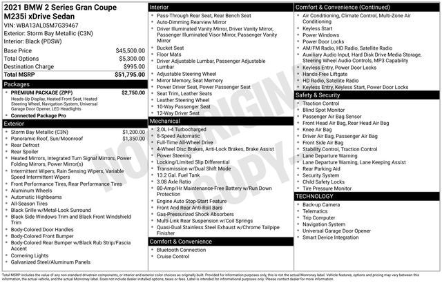2021 BMW 2 Series M235i Gran Coupe xDrive Storm Bay Metallic 23/32 City/Highway MPG