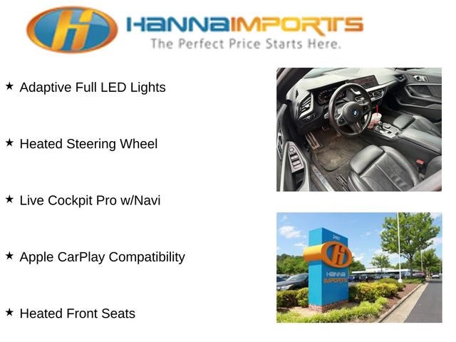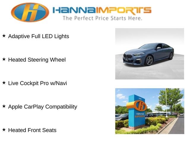 Why shop with Hanna Imports? We specialize in hand-selecting top-quality used cars, trucks, and SUVs for drivers across Raleigh, Durham, Cary, Chapel Hill, and the greater Triangle area of North Carolina. Our massive selection of 1,000+ vehicles on our Raleigh lot is carefully curated to include the most sought-after models, all priced below market value. We believe in transparency and efficiency—our vehicles are aggressively priced from the start, which means no haggling, no hassle, and no wasted time. The price you see is our absolute best price. Whether you're coming from Wake Forest, Apex, Garner, or anywhere in central NC, we’re committed to making your car-buying experience smooth, affordable, and enjoyable. Come see why Hanna Imports is one of the most trusted used car dealerships in North Carolina! Used BMW 2 Series in Raleigh. Used BMW 2 Series in North Carolina, Connected Package Pro, Premium Package (Adaptive Full LED Lights, Head-Up Display, Heated Front Seats, Heated Steering Wheel, Live Cockpit Pro w/Navi, and Universal Garage Door Opener), 2 Series M235i Gran Coupe xDrive, AWD, Apple CarPlay Compatibility, Exterior Parking Camera Rear, Navigation, Navigation System, Panoramic Moonroof, 10 Speakers, 4-Wheel Disc Brakes, ABS brakes, Air Conditioning, Alloy wheels, AM/FM radio: SiriusXM with 360L, Auto High-beam Headlights, Auto-dimming door mirrors, Auto-dimming Rear-View mirror, Automatic temperature control, BMW Assist eCall, BMW TeleServices, Brake assist, Bumpers: body-color, Compass, ConnectedDrive Services, Delay-off headlights, Driver door bin, Driver vanity mirror, Dual front impact airbags, Dual front side impact airbags, Electronic Stability Control, Emergency communication system: BMW Assist eCall, Four wheel independent suspension, Front anti-roll bar, Front Bucket Seats, Front Center Armrest, Front dual zone A/C, Front reading lights, Front Sport Bucket Seats, Fully automatic headlights, Heated door mirrors, Hi-Fi Sound System, Illuminated entry, Knee airbag, Low tire pressure warning, Lumbar Support, Memory seat, Occupant sensing airbag, Outside temperature display, Overhead airbag, Panic alarm, Passenger door bin, Passenger vanity mirror, Perforated Dakota Leather Upholstery, Power door mirrors, Power driver seat, Power Front Seats, Power passenger seat, Power steering, Power windows, Radio Control US, Radio data system, Radio: AM/FM Audio System, Rain sensing wipers, Rear anti-roll bar, Rear reading lights, Rear seat center armrest, Rear window defroster, Remote keyless entry, Security system, SiriusXM w/360L, Speed control, Speed-sensing steering, Speed-Sensitive Wipers, Split folding rear seat, Spoiler, Sport steering wheel, Steering wheel mounted audio controls, Tachometer, Telescoping steering wheel, Tilt steering wheel, Traction control, Trip computer, Turn signal indicator mirrors, Variably intermittent wipers, and Wheels: 18 x 8.0 M Double-Spoke Bi-Color.