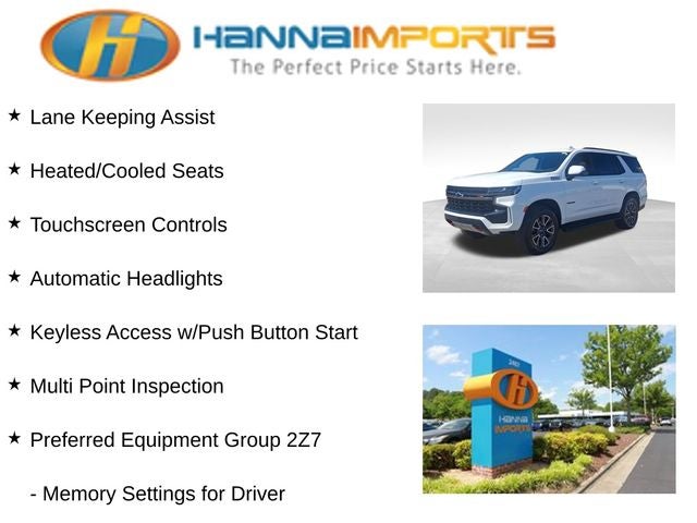 Why shop with Hanna Imports? We specialize in hand-selecting top-quality used cars, trucks, and SUVs for drivers across Raleigh, Durham, Cary, Chapel Hill, and the greater Triangle area of North Carolina. Our massive selection of 1,000+ vehicles on our Raleigh lot is carefully curated to include the most sought-after models, all priced below market value. We believe in transparency and efficiency—our vehicles are aggressively priced from the start, which means no haggling, no hassle, and no wasted time. The price you see is our absolute best price. Whether you're coming from Wake Forest, Apex, Garner, or anywhere in central NC, we’re committed to making your car-buying experience smooth, affordable, and enjoyable. Come see why Hanna Imports is one of the most trusted used car dealerships in North Carolina! Used Chevrolet Tahoe in Raleigh. Used Chevrolet Tahoe in North Carolina, Preferred Equipment Group 2Z7 (1st & 2nd Row Color-Keyed Carpeted Floor Mats, 2 USB Data Ports, 2-Speed Active Electronic AutoTrac Transfer Case, Auto-Dimming Inside Rear-View Mirror, Black Tubular Assist Steps, Bright Front & Rear Door Sill Plates, Color-Keyed Carpeting Floor Covering, Driver & Front Outboard Passenger Airbags, Floor Console w/Storage Area, Front High-Approach Angle Fascia, Hands-Free Rear Power Programmable Liftgate, HD Radio, Hill Descent Control, Infotainment Display, Leather-Wrapped Steering Wheel, LED Daytime Running Lamps, Memory Settings for Driver, Red Horizontal-Mounted Recovery Hooks, Remote Start, SiriusXM Radio w/360L, and Universal Home Remote), Tahoe Z71, 4WD, Jet Black w/Perforated Leather Seat Trim, Dual-Pane Power Panoramic Sunroof, Power Liftgate, 10-Way Power Driver & Passenger Seat Adjusters, 3.23 Rear Axle Ratio, 3rd row seats: split-bench, 4-Wheel Disc Brakes, 9 Speakers, ABS brakes, Air Conditioning, Alloy wheels, AM/FM radio: SiriusXM with 360L, Apple CarPlay/Android Auto, Auto High-beam Headlights, Auto-dimming Rear-View mirror, Automatic temperature control, Bose 9-Speaker Stereo Audio System Feature, Brake assist, Bumpers: body-color, Compass, Delay-off headlights, Driver door bin, Driver vanity mirror, Dual front impact airbags, Dual front side impact airbags, Electronic Stability Control, Emergency communication system: OnStar and Chevrolet connected services capable, Four wheel independent suspension, Front anti-roll bar, Front Bucket Seats, Front Center Armrest, Front dual zone A/C, Front High-Back Reclining Bucket Seats, Front reading lights, Fully automatic headlights, Garage door transmitter, Heated door mirrors, Heated Driver & Front Passenger Seats, Heated front seats, Illuminated entry, Leather Seat Trim, Leather steering wheel, Low tire pressure warning, Memory seat, Not Equipped w/Automatic Stop/Start