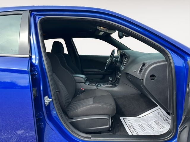 Equipped with Blacktop Package (Black 1-Piece Performance Spoiler, Black Badge, Black Dodge Grille Badge, Gloss Black I/P Cluster Trim Rings, Satin Black Charger Decklid Badge, Satin Black Dodge Tail Lamp Badge, and Wheels: 20 x 8.0 Black Noise Painted), Cold Weather Package (Heated Front Seats and Heated Steering Wheel), Quick Order Package 2EH, Black Cloth, 4-Wheel Disc Brakes, 6 Speakers, ABS brakes, Air Conditioning, Alloy wheels, AM/FM radio: SiriusXM, Anti-whiplash front head restraints, Apple CarPlay/Android Auto, Auto-dimming Rear-View mirror, Automatic temperature control, Brake assist, Bumpers: body-color, Cloth Performance Seats, Compass, Delay-off headlights, Driver door bin, Driver vanity mirror, Dual front impact airbags, Dual front side impact airbags, Electronic Stability Control, Emergency communication system: SiriusXM Guardian, Four wheel independent suspension, Front anti-roll bar, Front Bucket Seats, Front Center Armrest, Front dual zone A/C, Front fog lights, Front License Plate Bracket, Front reading lights, Fully automatic headlights, Garage door transmitter: HomeLink, Heated door mirrors, Illuminated entry, Knee airbag, Leather Shift Knob, Low tire pressure warning, Occupant sensing airbag, Outside temperature display, Overhead airbag, Overhead console, Panic alarm, ParkView Rear Back-Up Camera, Passenger door bin, Passenger vanity mirror, Power door mirrors, Power driver seat, Power steering, Power windows, Radio data system, Radio: Uconnect 4C w/8.4 Display, Rear anti-roll bar, Rear reading lights, Rear seat center armrest, Rear window defroster, Remote keyless entry, Speed control, Speed-Sensitive Wipers, Split folding rear seat, Spoiler, Sport steering wheel, Steering wheel mounted audio controls, Tachometer, Telescoping steering wheel, Tilt steering wheel, Traction control, Trip computer, Variably intermittent wipers, and Wheels: 20 x 8.0 Satin Carbon Painted.