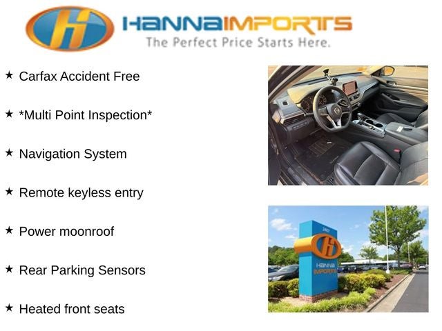 Why shop with Hanna Imports? We specialize in hand-selecting top-quality used cars, trucks, and SUVs for drivers across Raleigh, Durham, Cary, Chapel Hill, and the greater Triangle area of North Carolina. Our massive selection of 1,000+ vehicles on our Raleigh lot is carefully curated to include the most sought-after models, all priced below market value. We believe in transparency and efficiency—our vehicles are aggressively priced from the start, which means no haggling, no hassle, and no wasted time. The price you see is our absolute best price. Whether you're coming from Wake Forest, Apex, Garner, or anywhere in central NC, we’re committed to making your car-buying experience smooth, affordable, and enjoyable. Come see why Hanna Imports is one of the most trusted used car dealerships in North Carolina! Used Nissan Altima in Raleigh. Used Nissan Altima in North Carolina, Altima 2.5 SL, CVT with Xtronic, Heated front seats, Navigation System, Power moonroof, Rear Parking Sensors, Remote keyless entry, 17 Alloy Wheels, 4-Wheel Disc Brakes, 9 Speakers, ABS brakes, Air Conditioning, Alloy wheels, AM/FM radio, Auto High-beam Headlights, Automatic temperature control, Blind Spot Warning, Body-Colored Splash Guards, Brake assist, Bumpers: body-color, Chrome Bumper Protector, Delay-off headlights, Driver door bin, Driver vanity mirror, Dual front impact airbags, Dual front side impact airbags, Electronic Stability Control, Emergency communication system: NissanConnect Services, Floor Mats/Trunk Mat/Hideaway Net, Four wheel independent suspension, Front anti-roll bar, Front Bucket Seats, Front Center Armrest, Front dual zone A/C, Front fog lights, Front reading lights, Fully automatic headlights, Heated door mirrors, Heated Front Bucket Seats, Heated steering wheel, Illuminated entry, Illuminated Kick Plates, Knee airbag, Leather Shift Knob, Leather-Appointed Seat Trim, Low tire pressure warning, NissanConnect featuring Apple CarPlay and Android Auto, Occupant sensing airbag, Outside temperature display, Overhead airbag, Overhead console, Panic alarm, Passenger door bin, Passenger vanity mirror, Power door mirrors, Power driver seat, Power passenger seat, Power steering, Power windows, Radio data system, Radio: AM/FM w/Bose Premium Sound System, Rear anti-roll bar, Rear reading lights, Rear seat center armrest, Rear side impact airbag, Rear window defroster, Security system, Speed control, Speed-sensing steering, Speed-Sensitive Wipers, Split folding rear seat, Sport steering wheel, Steering wheel mounted audio controls, Tachometer, Telescoping steering wheel, Tilt steering wheel, Traction control, Trip computer, Trunk Organizer Tray, Turn signal indicator mirrors, and Variably intermittent wipers.
