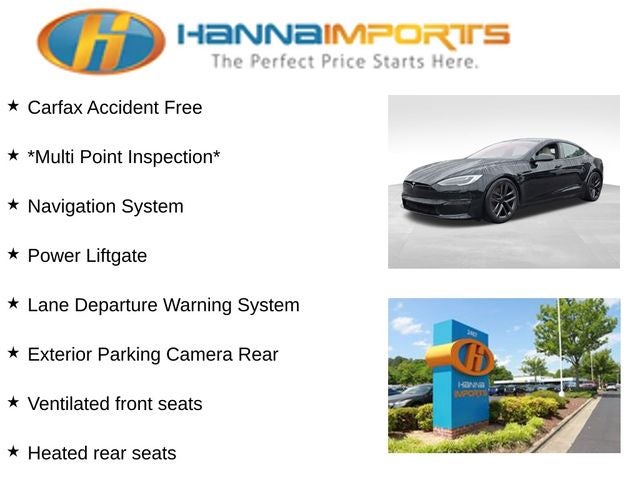 Why shop with Hanna Imports? We specialize in hand-selecting top-quality used cars, trucks, and SUVs for drivers across Raleigh, Durham, Cary, Chapel Hill, and the greater Triangle area of North Carolina. Our massive selection of 1,000+ vehicles on our Raleigh lot is carefully curated to include the most sought-after models, all priced below market value. We believe in transparency and efficiency—our vehicles are aggressively priced from the start, which means no haggling, no hassle, and no wasted time. The price you see is our absolute best price. Whether you're coming from Wake Forest, Apex, Garner, or anywhere in central NC, we’re committed to making your car-buying experience smooth, affordable, and enjoyable. Come see why Hanna Imports is one of the most trusted used car dealerships in North Carolina! Used Tesla Model S in Raleigh. Used Tesla Model S in North Carolina, Model S Plaid, AWD, Exterior Parking Camera Rear, Heated front seats, Heated rear seats, Lane Departure Warning System, Navigation System, Power Liftgate, Ventilated front seats, 22 Speakers, 4-Wheel Disc Brakes, ABS brakes, Adaptive suspension, Air Conditioning, Alloy wheels, Auto High-beam Headlights, Auto tilt-away steering wheel, Auto-dimming door mirrors, Auto-dimming Rear-View mirror, Auto-leveling suspension, Automatic temperature control, Brake assist, Bumpers: body-color, Compass, Delay-off headlights, Driver door bin, Driver vanity mirror, Dual front impact airbags, Dual front side impact airbags, Electronic Stability Control, Four wheel independent suspension, Front anti-roll bar, Front Bucket Seats, Front Center Armrest, Front dual zone A/C, Front fog lights, Front reading lights, Fully automatic headlights, Garage door transmitter: Homelink, Heated door mirrors, Heated steering wheel, Illuminated entry, Knee airbag, Leather steering wheel, Low tire pressure warning, Memory seat, Occupant sensing airbag, Outside temperature display, Overhead airbag, Passenger door bin, Passenger vanity mirror, Power door mirrors, Power driver seat, Power passenger seat, Power steering, Power windows, Premium Audio System, Premium Seat Trim, Radio data system, Rain sensing wipers, Rear air conditioning, Rear anti-roll bar, Rear audio controls, Rear reading lights, Rear seat center armrest, Rear window defroster, Remote keyless entry, Security system, Speed control, Speed-sensing steering, Speed-Sensitive Wipers, Split folding rear seat, Spoiler, Sport steering wheel, Steering wheel memory, Steering wheel mounted A/C controls, Steering wheel mounted audio controls, Telescoping steering wheel, Tilt steering wheel, Traction control, Trip computer, Variably intermittent wipers, Ventilated Front Bucket Seats, and Wheels: 19 Tempest.