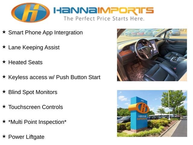 Why shop with Hanna Imports? We specialize in hand-selecting top-quality used cars, trucks, and SUVs for drivers across Raleigh, Durham, Cary, Chapel Hill, and the greater Triangle area of North Carolina. Our massive selection of 1,000+ vehicles on our Raleigh lot is carefully curated to include the most sought-after models, all priced below market value. We believe in transparency and efficiency—our vehicles are aggressively priced from the start, which means no haggling, no hassle, and no wasted time. The price you see is our absolute best price. Whether you're coming from Wake Forest, Apex, Garner, or anywhere in central NC, we’re committed to making your car-buying experience smooth, affordable, and enjoyable. Come see why Hanna Imports is one of the most trusted used car dealerships in North Carolina! Used Tesla Model X in Raleigh. Used Tesla Model X in North Carolina, Model X Long Range, AWD, 6 Seat Interior, Exterior Parking Camera Rear, Power Liftgate, 17 Speakers, 4-Wheel Disc Brakes, 9.73 Axle Ratio, ABS brakes, Adaptive suspension, Air Conditioning, Alloy wheels, Auto High-beam Headlights, Auto tilt-away steering wheel, Auto-dimming door mirrors, Auto-dimming Rear-View mirror, Auto-leveling suspension, Automatic temperature control, Brake assist, Bumpers: body-color, Compass, Delay-off headlights, Door auto-latch, Driver door bin, Driver vanity mirror, Dual front impact airbags, Dual front side impact airbags, Electronic Stability Control, Four wheel independent suspension, Front anti-roll bar, Front Bucket Seats, Front Center Armrest, Front dual zone A/C, Front fog lights, Front reading lights, Fully automatic headlights, Garage door transmitter: Homelink, Genuine wood console insert, Genuine wood dashboard insert, Genuine wood door panel insert, Head restraints memory, Heated door mirrors, Heated front seats, Heated rear seats, Heated steering wheel, Illuminated entry, Knee airbag, Lane Departure Warning System, Leather steering wheel, Low tire pressure warning, Memory seat, Navigation System, Occupant sensing airbag, Outside temperature display, Overhead airbag, Passenger door bin, Passenger vanity mirror, Power adjustable front head restraints, Power door mirrors, Power driver seat, Power passenger seat, Power steering, Power windows, Premium Audio System, Premium Seat Trim, Radio data system, Rain sensing wipers, Rear anti-roll bar, Rear reading lights, Rear side impact airbag, Rear window defroster, Remote keyless entry, Security system, Speed control, Speed-sensing steering, Speed-Sensitive Wipers, Split folding rear seat, Spoiler, Sport steering wheel, Steering wheel memory, Steering wheel mounted A/C controls, Steering wheel mounted audio controls, Telescoping steering wheel, Tilt steering wheel, Traction control, Trip computer, Variably intermittent wipers, and Wheels: 20 Silver.