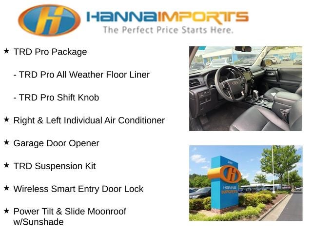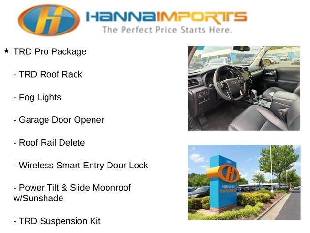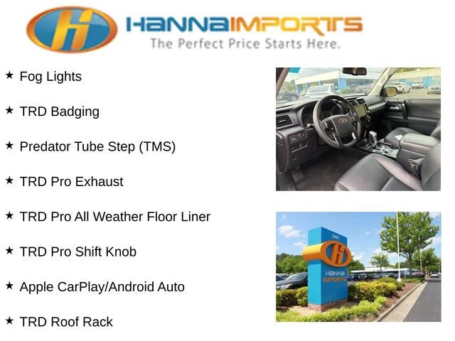 Why shop with Hanna Imports? We specialize in hand-selecting top-quality used cars, trucks, and SUVs for drivers across Raleigh, Durham, Cary, Chapel Hill, and the greater Triangle area of North Carolina. Our massive selection of 1,000+ vehicles on our Raleigh lot is carefully curated to include the most sought-after models, all priced below market value. We believe in transparency and efficiency—our vehicles are aggressively priced from the start, which means no haggling, no hassle, and no wasted time. The price you see is our absolute best price. Whether you're coming from Wake Forest, Apex, Garner, or anywhere in central NC, we’re committed to making your car-buying experience smooth, affordable, and enjoyable. Come see why Hanna Imports is one of the most trusted used car dealerships in North Carolina! Used Toyota 4Runner in Raleigh. Used Toyota 4Runner in North Carolina, TRD Pro Package (Fog Lights, Garage Door Opener, Power Tilt & Slide Moonroof w/Sunshade, Right & Left Individual Air Conditioner, Roof Rail Delete, TRD Badging, TRD Pro All Weather Floor Liner, TRD Pro Exhaust, TRD Pro Shift Knob, TRD Roof Rack, TRD Suspension Kit, and Wireless Smart Entry Door Lock), 4Runner TRD Pro, 4WD, Black/Graphite w/Softex Synthetic Leather Seat Trim, Apple CarPlay/Android Auto, Exterior Parking Camera Rear, Navigation System, Predator Tube Step (TMS), 15 Speakers, 3.727 Axle Ratio, 4-Wheel Disc Brakes, ABS brakes, Air Conditioning, Alloy wheels, AM/FM radio: SiriusXM, Anti-whiplash front head restraints, Auto High-beam Headlights, Auto-dimming Rear-View mirror, Brake assist, Bumpers: body-color, Compass, Driver door bin, Driver vanity mirror, Dual front impact airbags, Dual front side impact airbags, Electronic Stability Control, Emergency communication system: Safety Connect with 1-year trial, Front anti-roll bar, Front Bucket Seats, Front Center Armrest, Front fog lights, Front reading lights, Front wheel independent suspension, Garage door transmitter: HomeLink, Heated door mirrors, Heated Front Bucket Seats, Heated front seats, Illuminated entry, Knee airbag, Leather Shift Knob, Low tire pressure warning, Occupant sensing airbag, Outside temperature display, Overhead airbag, Overhead console, Panic alarm, Passenger door bin, Passenger vanity mirror, Power door mirrors, Power driver seat, Power moonroof, Power passenger seat, Power steering, Power windows, Radio: Premium JBL Audio, Rear anti-roll bar, Rear seat center armrest, Rear window defroster, Rear window wiper, Remote keyless entry, Roof rack, Security system, Softex Synthetic Leather Seat Trim, Speed control, Speed-sensing steering, Split folding rear seat, Spoiler, Steering wheel mounted audio controls, Tachometer, Telescoping steering wheel, Tilt steering wheel, Traction control, Trip computer, Turn signal indicator mirrors, Variably intermittent wipers, and Wheels: 17 Matte Black Flow-Formed TRD Alloy.