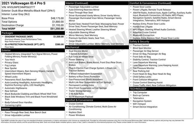 2021 Volkswagen ID.4 Pro S Blue Metallic Odometer is 3552 miles below market average! 98/88 City/Highway MPG