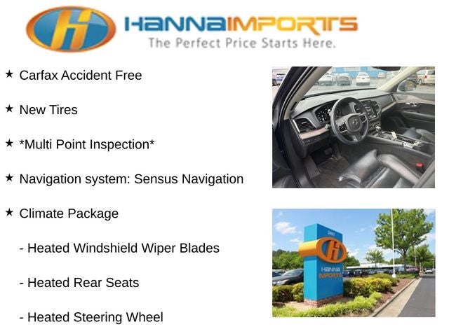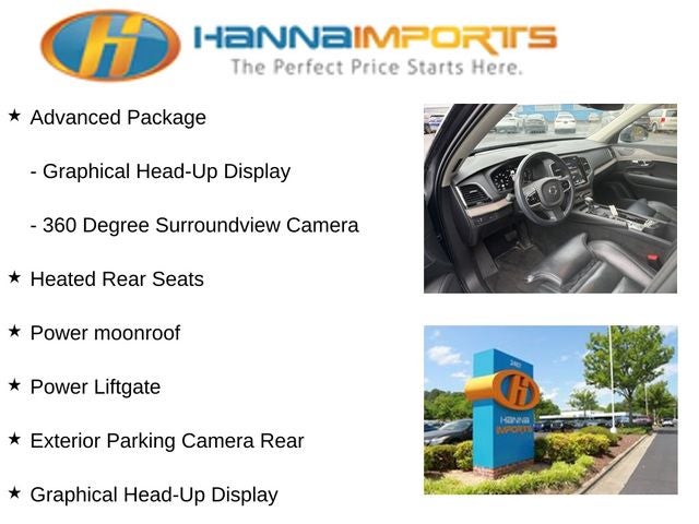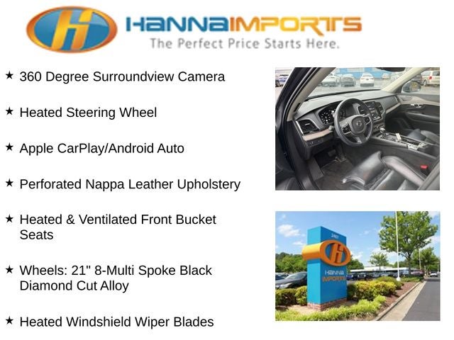 Why shop with Hanna Imports? We specialize in hand-selecting top-quality used cars, trucks, and SUVs for drivers across Raleigh, Durham, Cary, Chapel Hill, and the greater Triangle area of North Carolina. Our massive selection of 1,000+ vehicles on our Raleigh lot is carefully curated to include the most sought-after models, all priced below market value. We believe in transparency and efficiency—our vehicles are aggressively priced from the start, which means no haggling, no hassle, and no wasted time. The price you see is our absolute best price. Whether you're coming from Wake Forest, Apex, Garner, or anywhere in central NC, we’re committed to making your car-buying experience smooth, affordable, and enjoyable. Come see why Hanna Imports is one of the most trusted used car dealerships in North Carolina! Used Volvo XC90 in Raleigh. Used Volvo XC90 in North Carolina, Advanced Package (360 Degree Surroundview Camera and Graphical Head-Up Display), Climate Package (Heated Rear Seats, Heated Steering Wheel, and Heated Windshield Wiper Blades), XC90 T6 Inscription, AWD, Charcoal w/Perforated Nappa Leather Upholstery, Apple CarPlay/Android Auto, Exterior Parking Camera Rear, Heated & Ventilated Front Bucket Seats, Navigation system: Sensus Navigation, Perforated Nappa Leather Upholstery, Power Liftgate, Power moonroof, Wheels: 21 8-Multi Spoke Black Diamond Cut Alloy, 14 Speakers, 3rd row seats: bucket, 4-Wheel Disc Brakes, ABS brakes, Air Conditioning, AM/FM radio: SiriusXM, Anti-whiplash front head restraints, Auto High-beam Headlights, Auto-dimming door mirrors, Auto-dimming Rear-View mirror, Automatic temperature control, Bodyside moldings, Brake assist, Bumpers: body-color, Delay-off headlights, Driver door bin, Driver vanity mirror, Dual front impact airbags, Dual front side impact airbags, Electronic Stability Control, Emergency communication system: Volvo On-Call w/4 year subscription, Four wheel independent suspension, Front anti-roll bar, Front Bucket Seats, Front Center Armrest w/Storage, Front dual zone A/C, Front fog lights, Front reading lights, Fully automatic headlights, Garage door transmitter: HomeLink, Genuine wood dashboard insert, Genuine wood door panel insert, harman/kardon® Speakers, Headlight cleaning, Heated door mirrors, Heated front seats, Illuminated entry, Knee airbag, Leather Shift Knob, Low tire pressure warning, Memory seat, Occupant sensing airbag, Outside temperature display, Overhead airbag, Panic alarm, Passenger door bin, Passenger vanity mirror, Power door mirrors, Power driver seat, Power passenger seat, Power steering, Power windows, Premium audio system: Sensus Connect, Radio data system, Radio: harman/kardon Premium Audio System, Rain sensing wipers, Rear air conditioning, Rear anti-roll bar, Rear dual zone A/C, Rear fog lights, Rear reading lights, Rear seat center armrest, Rear window defroster, Rear window wiper, Remote keyless entry, Roof rack: rails only, Security system, Speed control, Speed-sensing steering, Split folding rear seat, Spoiler, Steering wheel mounted audio controls, Tachometer, Telescoping steering wheel, Tilt steering wheel, Traction control, Trip computer, Turn signal indicator mirrors, Variably intermittent wipers, and Ventilated front seats.