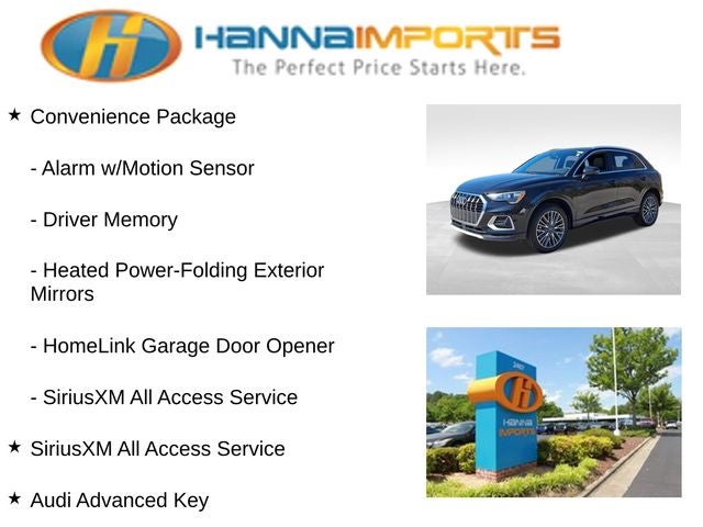 Why shop with Hanna Imports? We specialize in hand-selecting top-quality used cars, trucks, and SUVs for drivers across Raleigh, Durham, Cary, Chapel Hill, and the greater Triangle area of North Carolina. Our massive selection of 1,000+ vehicles on our Raleigh lot is carefully curated to include the most sought-after models, all priced below market value. We believe in transparency and efficiency—our vehicles are aggressively priced from the start, which means no haggling, no hassle, and no wasted time. The price you see is our absolute best price. Whether you're coming from Wake Forest, Apex, Garner, or anywhere in central NC, we’re committed to making your car-buying experience smooth, affordable, and enjoyable. Come see why Hanna Imports is one of the most trusted used car dealerships in North Carolina! Used Audi Q3 in Raleigh. Used Audi Q3 in North Carolina, 19 Wheel Package (Wheels: 19 20-Spoke-V Design Graphite Gray Finish), Convenience Package (Alarm w/Motion Sensor, Audi Advanced Key, Driver Memory, Frameless Auto-Dimming Interior Mirror w/Compass, Heated Power-Folding Exterior Mirrors, HomeLink Garage Door Opener, and SiriusXM All Access Service), LED Interior Lighting Package, Q3 Premium quattro, Exterior Parking Camera Rear, Power Liftgate, Power moonroof: Panoramic, 10 Speakers, 3.329 Axle Ratio, 4-Wheel Disc Brakes, ABS brakes, Air Conditioning, Alloy wheels, AM/FM radio, Audi Beam-Rings, Audi Guard Protection Kit, Audi smartphone interface (Apple CarPlay/Android Auto), Auto High-beam Headlights, Automatic temperature control, Brake assist, Bumpers: body-color, Delay-off headlights, Driver door bin, Driver vanity mirror, Dual front impact airbags, Dual front side impact airbags, Electronic Stability Control, Emergency communication system: Audi connect CARE, Four wheel independent suspension, Front anti-roll bar, Front Bucket Seats, Front Center Armrest, Front dual zone A/C, Front fog lights, Front reading lights, Fully automatic headlights, Heated door mirrors, Heated Front Bucket Seats, Heated front seats, Illuminated entry, Knee airbag, Leather Seating Surfaces, Leather Shift Knob, Leather steering wheel, Low tire pressure warning, Occupant sensing airbag, Outside temperature display, Overhead airbag, Overhead console, Panic alarm, Passenger door bin, Passenger vanity mirror, Power door mirrors, Power driver seat, Power passenger seat, Power steering, Power windows, Radio data system, Radio: Audi Sound System, Rain sensing wipers, Rear air conditioning, Rear anti-roll bar, Rear fog lights, Rear reading lights, Rear seat center armrest, Rear window defroster, Rear window wiper, Remote keyless entry, Speed control, Speed-sensing steering, Split folding rear seat, Spoiler, Steering wheel mounted audio controls, Tachometer, Telescoping steering wheel, Tilt steering wheel, Traction control, Trip computer, Turn signal indicator mirrors, Variably intermittent wipers, and Wheels: 18 5-Arm Design.
