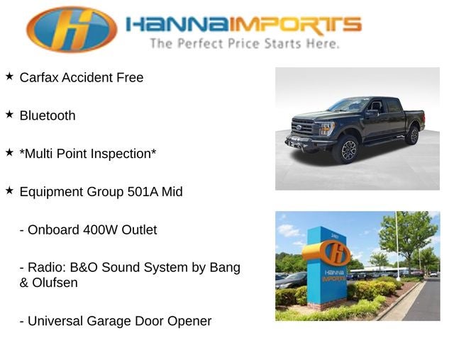 Why shop with Hanna Imports? We specialize in hand-selecting top-quality used cars, trucks, and SUVs for drivers across Raleigh, Durham, Cary, Chapel Hill, and the greater Triangle area of North Carolina. Our massive selection of 1,000+ vehicles on our Raleigh lot is carefully curated to include the most sought-after models, all priced below market value. We believe in transparency and efficiency—our vehicles are aggressively priced from the start, which means no haggling, no hassle, and no wasted time. The price you see is our absolute best price. Whether you're coming from Wake Forest, Apex, Garner, or anywhere in central NC, we’re committed to making your car-buying experience smooth, affordable, and enjoyable. Come see why Hanna Imports is one of the most trusted used car dealerships in North Carolina! Used Ford F-150 in Raleigh. Used Ford F-150 in North Carolina, Equipment Group 501A Mid (Onboard 400W Outlet, Radio: B&O Sound System by Bang & Olufsen, and Universal Garage Door Opener), FX4 Off-Road Package (4x4 FX4 Off-Road Bodyside Decal, Hill Descent Control, Monotube Rear Shocks, Off-Road Tuned Front Shock Absorbers, Rock Crawl Mode, and Tray Style Floor Liner (47W)), Lariat Sport Appearance Package (Accent-Color Angular Step Bars, Body-Color Front & Rear Bumpers, Box Side Decals, Chrome Single-Tip Exhaust, Dark 2-Bar & 1 Minor Bar Style Grille, and Wheels: 18 6-Spoke Machined Aluminum), Trailer Tow Package (Class IV Trailer Hitch Receiver, Integrated Trailer Brake Controller, and Pro Trailer Backup Assist), Bed Utility Package (BoxLink, LED Box Lighting, Power Tailgate, and Tailgate Step w/Tailgate Work Surface), F-150 Lariat, 4WD, 18 Machined-Aluminum Wheels, 4-Wheel Disc Brakes, 7 Speakers, ABS brakes, Adjustable pedals, Air Conditioning, Alloy wheels, AM/FM radio: SiriusXM with 360L, Auto High-beam Headlights, Auto Start-Stop Removal, Auto-dimming door mirrors, Auto-dimming Rear-View mirror, Automatic temperature control, Brake assist, Bumpers: chrome, Compass, Connected Navigation & SiriusXM w/360L Removal, Delay-off headlights, Driver door bin, Driver vanity mirror, Dual front impact airbags, Dual front side impact airbags, Electronic Stability Control, Emergency communication system: SYNC 4 911 Assist, Exterior Parking Camera Rear, Front anti-roll bar, Front Center Armrest w/Storage, Front dual zone A/C, Front fog lights, Front License Plate Bracket, Front reading lights, Front wheel independent suspension, Fully automatic headlights, Heated door mirrors, Heated front seats, Illuminated entry, Interior Work Surface, Leather-Trimmed 40/20/40 Front Seat, Low tire pressure warning, Memory seat, Occupant sensing airbag, Outside temperature display, Overhead airbag, Overhead console, Panic alarm, Passenger door bin, Passenger vanity mirror, Pedal memory, Power door mirrors, Power driver seat, Power passenger seat, Power steering, Power windows, Radio data system, Radio: AM/FM SiriusXM w/360L, Rear reading lights, Rear seat center armrest, Rear step bumper, Rear window defroster, Remote keyless entry, Security system, Speed control, Speed-sensing steering, Split folding rear seat, Steering wheel mounted audio controls, SYNC 4 w/Enhanced Voic