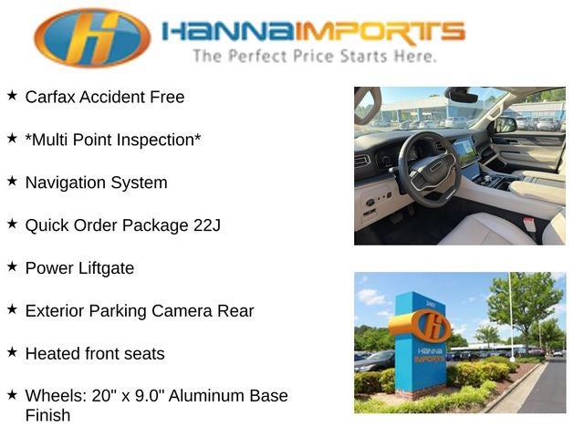 Why shop with Hanna Imports? We specialize in hand-selecting top-quality used cars, trucks, and SUVs for drivers across Raleigh, Durham, Cary, Chapel Hill, and the greater Triangle area of North Carolina. Our massive selection of 1,000+ vehicles on our Raleigh lot is carefully curated to include the most sought-after models, all priced below market value. We believe in transparency and efficiency—our vehicles are aggressively priced from the start, which means no haggling, no hassle, and no wasted time. The price you see is our absolute best price. Whether you're coming from Wake Forest, Apex, Garner, or anywhere in central NC, we’re committed to making your car-buying experience smooth, affordable, and enjoyable. Come see why Hanna Imports is one of the most trusted used car dealerships in North Carolina! Used Jeep Wagoneer in Raleigh. Used Jeep Wagoneer in North Carolina, Quick Order Package 22J, Wagoneer Series II, 5.7L V8, 4WD, Exterior Parking Camera Rear, Heated front seats, Navigation System, Power Liftgate, Wheels: 20 x 9.0 Aluminum Base Finish, 10 Speakers, 3.21 Rear Axle Ratio, 3rd row seats: bench, 4-Wheel Disc Brakes, ABS brakes, Adjustable pedals, Air Conditioning, Alloy wheels, AM/FM radio: SiriusXM with 360L, Anti-whiplash front head restraints, Audio memory, Auto-dimming door mirrors, Auto-dimming Rear-View mirror, Auto-leveling suspension, Automatic temperature control, Brake assist, Bumpers: body-color, Compass, Delay-off headlights, Driver door bin, Driver vanity mirror, Driver's Seat Mounted Armrest, Dual front impact airbags, Dual front side impact airbags, Electronic Stability Control, Four wheel independent suspension, Front anti-roll bar, Front Bucket Seats, Front Center Armrest w/Storage, Front dual zone A/C, Front fog lights, Front reading lights, Fully automatic headlights, Garage door transmitter, Genuine wood console insert, Genuine wood dashboard insert, Genuine wood door panel insert, Heated door mirrors, Heated steering wheel, Illuminated entry, Knee airbag, Leather Trimmed Bucket Seats, Low tire pressure warning, Memory seat, Normal Duty Suspension, Occupant sensing airbag, Outside temperature display, Overhead airbag, Overhead console, Panic alarm, Passenger door bin, Passenger seat mounted armrest, Passenger vanity mirror, Pedal memory, Power adjustable front head restraints, Power door mirrors, Power driver seat, Power passenger seat, Power steering, Power windows, Radio data system, Radio: Uconnect 5 Nav w/10.1 Display, Rain sensing wipers, Rear air conditioning, Rear anti-roll bar, Rear dual zone A/C, Rear reading lights, Rear seat center armrest, Rear window defroster, Rear window wiper, Reclining 3rd row seat, Remote keyless entry, Security system, Speed control, Speed-sensing steering, Speed-Sensitive Wipers, Split folding rear seat, Steering wheel memory, Steering wheel mounted audio controls, Tachometer, Telescoping steering wheel, Tilt steering wheel, Traction control, Trip computer, Turn signal indicator mirrors, Variably intermittent wipers, Ventilated front seats, and Voltmeter.