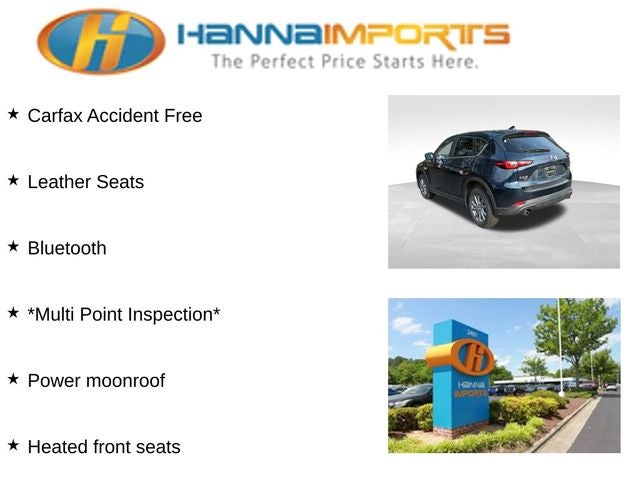 Why shop with Hanna Imports? We specialize in hand-selecting top-quality used cars, trucks, and SUVs for drivers across Raleigh, Durham, Cary, Chapel Hill, and the greater Triangle area of North Carolina. Our massive selection of 1,000+ vehicles on our Raleigh lot is carefully curated to include the most sought-after models, all priced below market value. We believe in transparency and efficiency—our vehicles are aggressively priced from the start, which means no haggling, no hassle, and no wasted time. The price you see is our absolute best price. Whether you're coming from Wake Forest, Apex, Garner, or anywhere in central NC, we’re committed to making your car-buying experience smooth, affordable, and enjoyable. Come see why Hanna Imports is one of the most trusted used car dealerships in North Carolina! Used Mazda CX-5 in Raleigh. Used Mazda CX-5 in North Carolina, SKYACTIV® 2.5L 4-Cylinder DOHC 16V, AWD, Heated front seats, Power moonroof, 4-Wheel Disc Brakes, 4.624 Axle Ratio, 6 Speakers, ABS brakes, Air Conditioning, Alloy wheels, AM/FM radio, AppLink/Apple CarPlay and Android Auto, Auto High-beam Headlights, Auto-dimming Rear-View mirror, Automatic temperature control, Bose Audio Credit, Brake assist, Bumpers: body-color, Delay-off headlights, Driver door bin, Driver vanity mirror, Dual front impact airbags, Dual front side impact airbags, E911 Automatic Emergency Notification, Electronic Stability Control, Emergency communication system: MAZDA CONNECT, Exterior Parking Camera Rear, Four wheel independent suspension, Front anti-roll bar, Front Bucket Seats, Front Center Armrest w/Storage, Front dual zone A/C, Front reading lights, Fully automatic headlights, Garage door transmitter: HomeLink, Heated Front Bucket Seats, Illuminated entry, Infotainment System Voice Command, Leather Seat Trim, Leather Shift Knob, Low tire pressure warning, Memory seat, Multifunction Commander Control, Occupant sensing airbag, Outside temperature display, Overhead airbag, Overhead console, Pandora, Panic alarm, Passenger door bin, Passenger vanity mirror, Power door mirrors, Power driver seat, Power passenger seat, Power steering, Power windows, Radio Broadcast Data System Program Information, Radio data system, Radio: AM/FM/HD Audio System, Rain sensing wipers, Rear anti-roll bar, Rear Bumper Guard, Rear reading lights, Rear seat center armrest, Rear window defroster, Rear window wiper, Remote keyless entry, SMS Text Msg Audio Delivery & Reply, Speed control, Speed-sensing steering, Split folding rear seat, Spoiler, Steering wheel mounted audio controls, Tachometer, Telescoping steering wheel, Tilt steering wheel, Traction control, Trip computer, Turn signal indicator mirrors, Variably intermittent wipers, and Wheels: 17 x 7J Aluminum Alloy.
