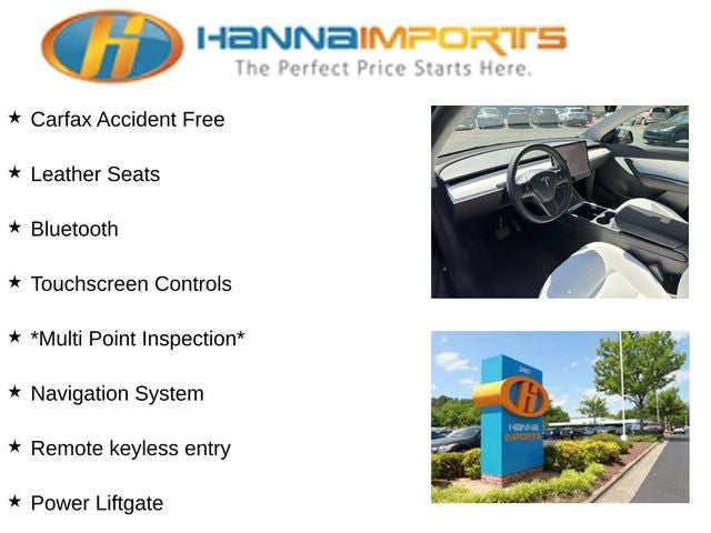Why shop with Hanna Imports? We specialize in hand-selecting top-quality used cars, trucks, and SUVs for drivers across Raleigh, Durham, Cary, Chapel Hill, and the greater Triangle area of North Carolina. Our massive selection of 1,000+ vehicles on our Raleigh lot is carefully curated to include the most sought-after models, all priced below market value. We believe in transparency and efficiency—our vehicles are aggressively priced from the start, which means no haggling, no hassle, and no wasted time. The price you see is our absolute best price. Whether you're coming from Wake Forest, Apex, Garner, or anywhere in central NC, we’re committed to making your car-buying experience smooth, affordable, and enjoyable. Come see why Hanna Imports is one of the most trusted used car dealerships in North Carolina! Used Tesla Model Y in Raleigh. Used Tesla Model Y in North Carolina, Model Y Long Range, AWD, Exterior Parking Camera Rear, Heated front seats, Heated rear seats, Lane Departure Warning System, Navigation System, Power Liftgate, Remote keyless entry, 14 Speakers, 4-Wheel Disc Brakes, 5 Seat Interior, 9.0 Axle Ratio, ABS brakes, Air Conditioning, Alloy wheels, Audio memory, Auto High-beam Headlights, Auto tilt-away steering wheel, Auto-dimming door mirrors, Auto-dimming Rear-View mirror, Automatic temperature control, Brake assist, Bumpers: body-color, Compass, Delay-off headlights, Driver door bin, Driver vanity mirror, Dual front impact airbags, Dual front side impact airbags, Electronic Stability Control, Four wheel independent suspension, Front anti-roll bar, Front Bucket Seats, Front Center Armrest, Front dual zone A/C, Front fog lights, Front reading lights, Fully automatic headlights, Genuine wood dashboard insert, Heated door mirrors, Heated steering wheel, HVAC memory, Illuminated entry, Knee airbag, Low tire pressure warning, Memory seat, Occupant sensing airbag, Outside temperature display, Overhead airbag, Passenger door bin, Passenger vanity mirror, Power door mirrors, Power driver seat, Power passenger seat, Power steering, Power windows, Premium Audio System, Premium Seat Trim, Radio data system, Rain sensing wipers, Rear reading lights, Rear seat center armrest, Rear window defroster, Security system, Speed control, Speed-sensing steering, Split folding rear seat, Steering wheel memory, Steering wheel mounted A/C controls, Steering wheel mounted audio controls, Telescoping steering wheel, Tilt steering wheel, Traction control, Trip computer, Variably intermittent wipers, and Wheels: 19 x 9.5 Gemini.