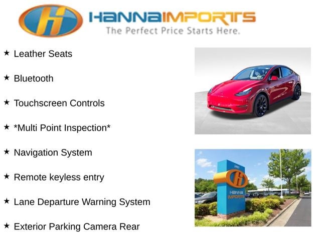 Why shop with Hanna Imports? We specialize in hand-selecting top-quality used cars, trucks, and SUVs for drivers across Raleigh, Durham, Cary, Chapel Hill, and the greater Triangle area of North Carolina. Our massive selection of 1,000+ vehicles on our Raleigh lot is carefully curated to include the most sought-after models, all priced below market value. We believe in transparency and efficiency—our vehicles are aggressively priced from the start, which means no haggling, no hassle, and no wasted time. The price you see is our absolute best price. Whether you're coming from Wake Forest, Apex, Garner, or anywhere in central NC, we’re committed to making your car-buying experience smooth, affordable, and enjoyable. Come see why Hanna Imports is one of the most trusted used car dealerships in North Carolina! Used Tesla Model Y in Raleigh. Used Tesla Model Y in North Carolina, Model Y Long Range, AWD, Exterior Parking Camera Rear, Lane Departure Warning System, Navigation System, Remote keyless entry, 14 Speakers, 4-Wheel Disc Brakes, 5 Seat Interior, 9.0 Axle Ratio, ABS brakes, Air Conditioning, Alloy wheels, Audio memory, Auto High-beam Headlights, Auto tilt-away steering wheel, Auto-dimming door mirrors, Auto-dimming Rear-View mirror, Automatic temperature control, Brake assist, Bumpers: body-color, Compass, Delay-off headlights, Driver door bin, Driver vanity mirror, Dual front impact airbags, Dual front side impact airbags, Electronic Stability Control, Four wheel independent suspension, Front anti-roll bar, Front Bucket Seats, Front Center Armrest, Front dual zone A/C, Front fog lights, Front reading lights, Fully automatic headlights, Genuine wood dashboard insert, Heated door mirrors, Heated front seats, Heated rear seats, Heated steering wheel, HVAC memory, Illuminated entry, Knee airbag, Low tire pressure warning, Memory seat, Occupant sensing airbag, Outside temperature display, Overhead airbag, Passenger door bin, Passenger vanity mirror, Power door mirrors, Power driver seat, Power Liftgate, Power passenger seat, Power steering, Power windows, Premium Audio System, Premium Seat Trim, Radio data system, Rain sensing wipers, Rear reading lights, Rear seat center armrest, Rear window defroster, Security system, Speed control, Speed-sensing steering, Split folding rear seat, Steering wheel memory, Steering wheel mounted A/C controls, Steering wheel mounted audio controls, Telescoping steering wheel, Tilt steering wheel, Traction control, Trip computer, Variably intermittent wipers, and Wheels: 19 x 9.5 Gemini.
