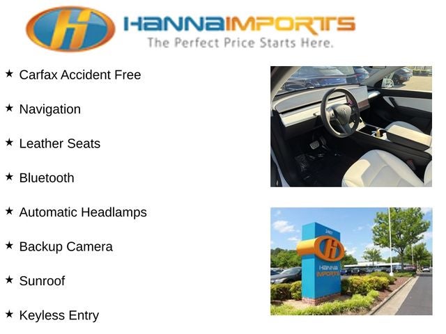 Why shop with Hanna Imports? We specialize in hand-selecting top-quality used cars, trucks, and SUVs for drivers across Raleigh, Durham, Cary, Chapel Hill, and the greater Triangle area of North Carolina. Our massive selection of 1,000+ vehicles on our Raleigh lot is carefully curated to include the most sought-after models, all priced below market value. We believe in transparency and efficiency—our vehicles are aggressively priced from the start, which means no haggling, no hassle, and no wasted time. The price you see is our absolute best price. Whether you're coming from Wake Forest, Apex, Garner, or anywhere in central NC, we’re committed to making your car-buying experience smooth, affordable, and enjoyable. Come see why Hanna Imports is one of the most trusted used car dealerships in North Carolina! Used Tesla Model Y in Raleigh. Used Tesla Model Y in North Carolina, Model Y Long Range, AWD, Exterior Parking Camera Rear, Lane Departure Warning System, Power Liftgate, 14 Speakers, 4-Wheel Disc Brakes, 5 Seat Interior, 9.0 Axle Ratio, ABS brakes, Air Conditioning, Alloy wheels, Audio memory, Auto High-beam Headlights, Auto tilt-away steering wheel, Auto-dimming door mirrors, Auto-dimming Rear-View mirror, Automatic temperature control, Brake assist, Bumpers: body-color, Compass, Delay-off headlights, Driver door bin, Driver vanity mirror, Dual front impact airbags, Dual front side impact airbags, Electronic Stability Control, Four wheel independent suspension, Front anti-roll bar, Front Bucket Seats, Front Center Armrest, Front dual zone A/C, Front fog lights, Front reading lights, Fully automatic headlights, Genuine wood dashboard insert, Heated door mirrors, Heated front seats, Heated rear seats, Heated steering wheel, HVAC memory, Illuminated entry, Knee airbag, Low tire pressure warning, Memory seat, Navigation System, Occupant sensing airbag, Outside temperature display, Overhead airbag, Passenger door bin, Passenger vanity mirror, Power door mirrors, Power driver seat, Power passenger seat, Power steering, Power windows, Premium Audio System, Premium Seat Trim, Radio data system, Rain sensing wipers, Rear reading lights, Rear seat center armrest, Rear window defroster, Remote keyless entry, Security system, Speed control, Speed-sensing steering, Split folding rear seat, Steering wheel memory, Steering wheel mounted A/C controls, Steering wheel mounted audio controls, Telescoping steering wheel, Tilt steering wheel, Traction control, Trip computer, Variably intermittent wipers, and Wheels: 19 x 9.5 Gemini.