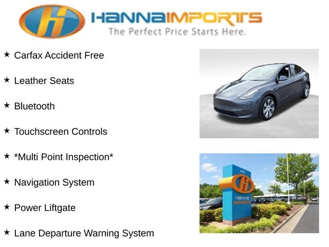Why shop with Hanna Imports? We specialize in hand-selecting top-quality used cars, trucks, and SUVs for drivers across Raleigh, Durham, Cary, Chapel Hill, and the greater Triangle area of North Carolina. Our massive selection of 1,000+ vehicles on our Raleigh lot is carefully curated to include the most sought-after models, all priced below market value. We believe in transparency and efficiency—our vehicles are aggressively priced from the start, which means no haggling, no hassle, and no wasted time. The price you see is our absolute best price. Whether you're coming from Wake Forest, Apex, Garner, or anywhere in central NC, we’re committed to making your car-buying experience smooth, affordable, and enjoyable. Come see why Hanna Imports is one of the most trusted used car dealerships in North Carolina! Used Tesla Model Y in Raleigh. Used Tesla Model Y in North Carolina, Model Y Long Range, AWD, Exterior Parking Camera Rear, Lane Departure Warning System, Navigation System, Power Liftgate, 14 Speakers, 4-Wheel Disc Brakes, 5 Seat Interior, 9.0 Axle Ratio, ABS brakes, Air Conditioning, Alloy wheels, Audio memory, Auto High-beam Headlights, Auto tilt-away steering wheel, Auto-dimming door mirrors, Auto-dimming Rear-View mirror, Automatic temperature control, Brake assist, Bumpers: body-color, Compass, Delay-off headlights, Driver door bin, Driver vanity mirror, Dual front impact airbags, Dual front side impact airbags, Electronic Stability Control, Four wheel independent suspension, Front anti-roll bar, Front Bucket Seats, Front Center Armrest, Front dual zone A/C, Front fog lights, Front reading lights, Fully automatic headlights, Genuine wood dashboard insert, Heated door mirrors, Heated front seats, Heated rear seats, Heated steering wheel, HVAC memory, Illuminated entry, Knee airbag, Low tire pressure warning, Memory seat, Occupant sensing airbag, Outside temperature display, Overhead airbag, Passenger door bin, Passenger vanity mirror, Power door mirrors, Power driver seat, Power passenger seat, Power steering, Power windows, Premium Audio System, Premium Seat Trim, Radio data system, Rain sensing wipers, Rear reading lights, Rear seat center armrest, Rear window defroster, Remote keyless entry, Security system, Speed control, Speed-sensing steering, Split folding rear seat, Steering wheel memory, Steering wheel mounted A/C controls, Steering wheel mounted audio controls, Telescoping steering wheel, Tilt steering wheel, Traction control, Trip computer, Variably intermittent wipers, and Wheels: 19 x 9.5 Gemini.