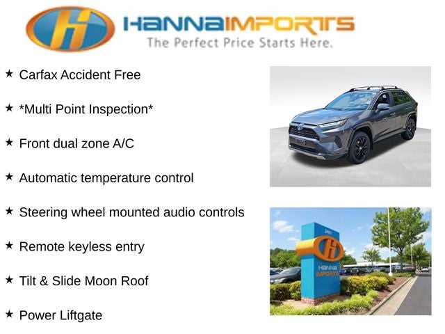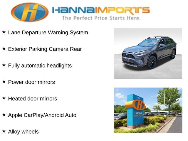 Why shop with Hanna Imports? We specialize in hand-selecting top-quality used cars, trucks, and SUVs for drivers across Raleigh, Durham, Cary, Chapel Hill, and the greater Triangle area of North Carolina. Our massive selection of 1,000+ vehicles on our Raleigh lot is carefully curated to include the most sought-after models, all priced below market value. We believe in transparency and efficiency—our vehicles are aggressively priced from the start, which means no haggling, no hassle, and no wasted time. The price you see is our absolute best price. Whether you're coming from Wake Forest, Apex, Garner, or anywhere in central NC, we’re committed to making your car-buying experience smooth, affordable, and enjoyable. Come see why Hanna Imports is one of the most trusted used car dealerships in North Carolina! Used Toyota RAV4 Hybrid in Raleigh. Used Toyota RAV4 Hybrid in North Carolina, 2.5L 4-Cylinder, Alloy wheels, Apple CarPlay/Android Auto, Automatic temperature control, Exterior Parking Camera Rear, Front dual zone A/C, Fully automatic headlights, Heated door mirrors, Lane Departure Warning System, Power door mirrors, Power Liftgate, Remote keyless entry, Steering wheel mounted audio controls, Tilt & Slide Moon Roof, 4-Wheel Disc Brakes, 6 Speakers, ABS brakes, Air Conditioning, AM/FM radio: SiriusXM, AM/FM Stereo, Auto High-beam Headlights, Axle Ratio: TBD, Brake assist, Bumpers: body-color, Delay-off headlights, Driver door bin, Driver vanity mirror, Dual front impact airbags, Dual front side impact airbags, Electronic Stability Control, Emergency communication system: Safety Connect with 1-year trial, Fabric Seat Trim (FC), Four wheel independent suspension, Front anti-roll bar, Front Bucket Seats, Front Center Armrest, Front fog lights, Front reading lights, Front Sport Seats, Illuminated entry, Knee airbag, Leather Shift Knob, Low tire pressure warning, Occupant sensing airbag, Outside temperature display, Overhead airbag, Overhead console, Panic alarm, Passenger door bin, Passenger vanity mirror, Power driver seat, Power steering, Power windows, Radio data system, Rear anti-roll bar, Rear seat center armrest, Rear window defroster, Rear window wiper, Roof rack: rails only, Speed control, Speed-sensing steering, Split folding rear seat, Spoiler, Telescoping steering wheel, Tilt steering wheel, Traction control, Trip computer, Turn signal indicator mirrors, Variably intermittent wipers, and Wheels: 18 x 7.0J Silver Aluminum Alloy.