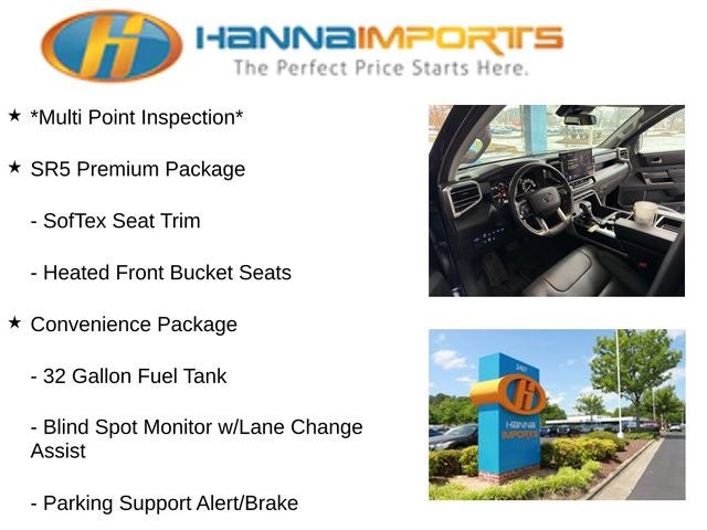 Why shop with Hanna Imports? We specialize in hand-selecting top-quality used cars, trucks, and SUVs for drivers across Raleigh, Durham, Cary, Chapel Hill, and the greater Triangle area of North Carolina. Our massive selection of 1,000+ vehicles on our Raleigh lot is carefully curated to include the most sought-after models, all priced below market value. We believe in transparency and efficiency—our vehicles are aggressively priced from the start, which means no haggling, no hassle, and no wasted time. The price you see is our absolute best price. Whether you're coming from Wake Forest, Apex, Garner, or anywhere in central NC, we’re committed to making your car-buying experience smooth, affordable, and enjoyable. Come see why Hanna Imports is one of the most trusted used car dealerships in North Carolina! Used Toyota Tundra in Raleigh. Used Toyota Tundra in North Carolina, Convenience Package (32 Gallon Fuel Tank, Blind Spot Monitor w/Lane Change Assist, and Parking Support Alert/Brake), SR5 Premium Package (Heated Front Bucket Seats and SofTex Seat Trim), Black w/Leather Seat Trim, 400W/120V AC Deck & Cabin Power Supply, Apple CarPlay/Android Auto, Exterior Parking Camera Rear, Heated Leather Steering Wheel, Load-Leveling Rear Air Suspension, Predator Drop Step (TMS), Radio: Premium Audio, 18 x 8 Alloy Wheels, 3.31 Axle Ratio, 4-Wheel Disc Brakes, 9 Speakers, ABS brakes, Air Conditioning, Alloy wheels, AM/FM Radio, AM/FM radio: SiriusXM, Auto High-beam Headlights, Automatic temperature control, Brake assist, Bumpers: body-color, Delay-off headlights, Driver door bin, Driver vanity mirror, Dual front impact airbags, Dual front side impact airbags, Electronic Stability Control, Emergency communication system: Safety Connect with 1-year trial, Fabric Seat Trim, Front anti-roll bar, Front Bucket Seats, Front Center Armrest, Front fog lights, Front reading lights, Front wheel independent suspension, Fully automatic headlights, Heated door mirrors, Illuminated entry, Knee airbag, Low tire pressure warning, Occupant sensing airbag, Outside temperature display, Overhead airbag, Overhead console, Panic alarm, Passenger door bin, Passenger vanity mirror, Power door mirrors, Power steering, Power windows, Radio data system, Rear reading lights, Rear step bumper, Rear window defroster, Remote keyless entry, Security system, Speed control, Speed-sensing steering, Split folding rear seat, Steering wheel mounted audio controls, Tachometer, Telescoping steering wheel, Tilt steering wheel, Traction control, Trip computer, Turn signal indicator mirrors, Variably intermittent wipers, and Voltmeter.