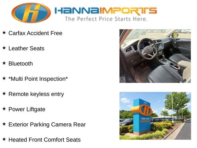Why shop with Hanna Imports? We specialize in hand-selecting top-quality used cars, trucks, and SUVs for drivers across Raleigh, Durham, Cary, Chapel Hill, and the greater Triangle area of North Carolina. Our massive selection of 1,000+ vehicles on our Raleigh lot is carefully curated to include the most sought-after models, all priced below market value. We believe in transparency and efficiency—our vehicles are aggressively priced from the start, which means no haggling, no hassle, and no wasted time. The price you see is our absolute best price. Whether you're coming from Wake Forest, Apex, Garner, or anywhere in central NC, we’re committed to making your car-buying experience smooth, affordable, and enjoyable. Come see why Hanna Imports is one of the most trusted used car dealerships in North Carolina! Used Volkswagen Tiguan in Raleigh. Used Volkswagen Tiguan in North Carolina, Tiguan 2.0T SE, Exterior Parking Camera Rear, Heated Front Comfort Seats, Power Liftgate, Remote keyless entry, 3-Row Rubber Monster Mats w/Logo Kit (Set of 5), 3.33 Axle Ratio, 3rd row seats: bench, 4-Wheel Disc Brakes, 4-Wheel Independent Suspension, 6 Speakers, ABS brakes, Air Conditioning, Alloy wheels, AM/FM radio: SiriusXM with 360L, Auto-dimming Rear-View mirror, Auto-Dimming Rearview Mirror w/HomeLink Connect (DISC), Automatic temperature control, Brake assist, Bumpers: body-color, Compass, Delay-off headlights, Driver door bin, Driver vanity mirror, Dual front impact airbags, Dual front side impact airbags, Electronic Stability Control, Emergency communication system: Car-Net, First Aid Kit, Four wheel independent suspension, Front anti-roll bar, Front Bucket Seats, Front Center Armrest, Front dual zone A/C, Front reading lights, Fully automatic headlights, Heated door mirrors, Heated front seats, Heavy Duty Trunk Liner w/VW CarGo Blocks, Illuminated entry, Leather Shift Knob, Low tire pressure warning, Occupant sensing airbag, Outside temperature display, Overhead airbag, Overhead console, Panic alarm, Passenger door bin, Passenger vanity mirror, Perforated V-Tex Leatherette Seating Surfaces, Power door mirrors, Power driver seat, Power steering, Power windows, Radio data system, Radio: MIB3 Composition Media AM/FM/HD, Rain sensing wipers, Rear anti-roll bar, Rear reading lights, Rear seat center armrest, Rear window defroster, Rear window wiper, Roadside Assistance Kit, Roof rack: rails only, Security system, Speed control, Speed-sensing steering, Split folding rear seat, Spoiler, Steering wheel mounted audio controls, Tachometer, Telescoping steering wheel, Tilt steering wheel, Traction control, Trip computer, Turn signal indicator mirrors, Variably intermittent wipers, and Wheels: 18 Dark Graphite 10-Spoke Alloy.