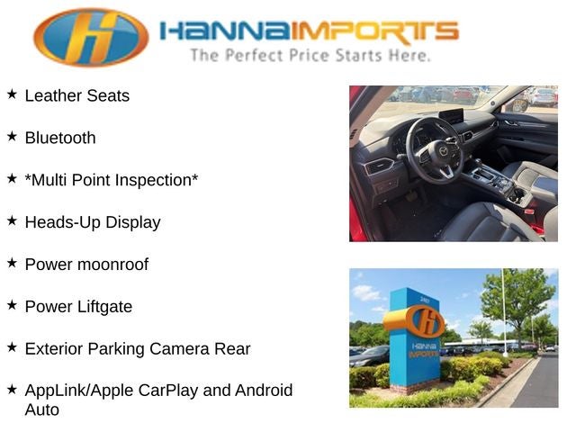 Why shop with Hanna Imports? We specialize in hand-selecting top-quality used cars, trucks, and SUVs for drivers across Raleigh, Durham, Cary, Chapel Hill, and the greater Triangle area of North Carolina. Our massive selection of 1,000+ vehicles on our Raleigh lot is carefully curated to include the most sought-after models, all priced below market value. We believe in transparency and efficiency—our vehicles are aggressively priced from the start, which means no haggling, no hassle, and no wasted time. The price you see is our absolute best price. Whether you're coming from Wake Forest, Apex, Garner, or anywhere in central NC, we’re committed to making your car-buying experience smooth, affordable, and enjoyable. Come see why Hanna Imports is one of the most trusted used car dealerships in North Carolina! Used Mazda CX-5 in Raleigh. Used Mazda CX-5 in North Carolina, CX-5 2.5 S Premium Plus Package, AWD, AppLink/Apple CarPlay and Android Auto, Exterior Parking Camera Rear, Heads-Up Display, Heated front seats, Heated rear seats, Power Liftgate, Power moonroof, 10 Speakers, 4-Wheel Disc Brakes, 4.624 Axle Ratio, ABS brakes, Air Conditioning, Alloy wheels, AM/FM radio: SiriusXM, Auto High-beam Headlights, Auto-dimming Rear-View mirror, Automatic temperature control, Black Lug Nuts & Black Wheel Locks, Brake assist, Bumpers: body-color, Cargo Tray, Delay-off headlights, Driver door bin, Driver vanity mirror, Dual front impact airbags, Dual front side impact airbags, E911 Automatic Emergency Notification, Electronic Stability Control, Emergency communication system: MAZDA CONNECT, Four wheel independent suspension, Front anti-roll bar, Front Bucket Seats, Front Center Armrest w/Storage, Front dual zone A/C, Front reading lights, Fully automatic headlights, Garage door transmitter: HomeLink, Heated door mirrors, Heated steering wheel, Heated/Ventilated Front Bucket Seats, Illuminated entry, Infotainment System Voice Command, Leather Seat Trim, Leather Shift Knob, Low tire pressure warning, Memory seat, Multifunction Commander Control, Occupant sensing airbag, Outside temperature display, Overhead airbag, Overhead console, Pandora, Panic alarm, Passenger door bin, Passenger vanity mirror, Power door mirrors, Power driver seat, Power passenger seat, Power steering, Power windows, Radio Broadcast Data System Program Information, Radio data system, Radio: AM/FM/HD Audio System, Rain sensing wipers, Rear anti-roll bar, Rear Bumper Guard, Rear reading lights, Rear seat center armrest, Rear window defroster, Rear window wiper, Remote keyless entry, SMS Text Msg Audio Delivery & Reply, Soul Red Crystal Metallic Paint, Speed control, Speed-sensing steering, Split folding rear seat, Spoiler, Steering wheel mounted audio controls, Tachometer, Telescoping steering wheel, Tilt steering wheel, Traction control, Trip computer, Turn signal indicator mirrors, Variably intermittent wipers, Ventilated front seats, and Wheels: 19 x 7J Aluminum Alloy.
