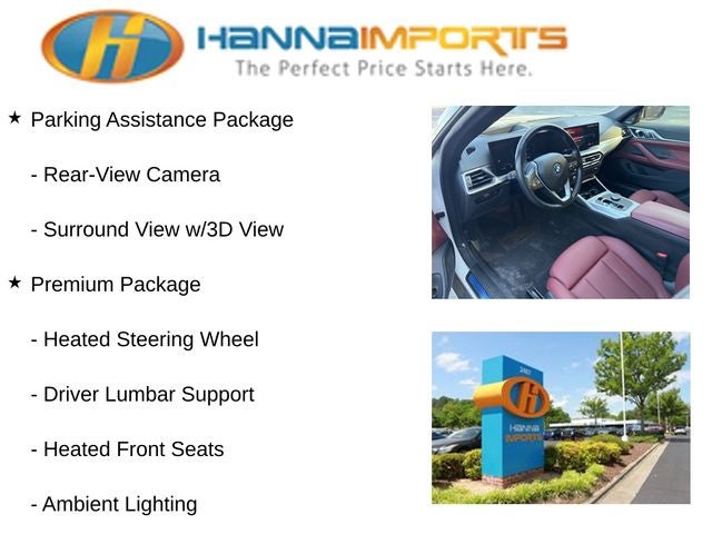 Why shop with Hanna Imports? We specialize in hand-selecting top-quality used cars, trucks, and SUVs for drivers across Raleigh, Durham, Cary, Chapel Hill, and the greater Triangle area of North Carolina. Our massive selection of 1,000+ vehicles on our Raleigh lot is carefully curated to include the most sought-after models, all priced below market value. We believe in transparency and efficiency—our vehicles are aggressively priced from the start, which means no haggling, no hassle, and no wasted time. The price you see is our absolute best price. Whether you're coming from Wake Forest, Apex, Garner, or anywhere in central NC, we’re committed to making your car-buying experience smooth, affordable, and enjoyable. Come see why Hanna Imports is one of the most trusted used car dealerships in North Carolina! Used BMW i4 in Raleigh. Used BMW i4 in North Carolina, Connected Package Pro, Parking Assistance Package (Active Park Distance Control, Parking Assistant Plus, Rear-View Camera, and Surround View w/3D View), Premium Package (Ambient Lighting, Driver Lumbar Support, Heated Front Seats, Heated Steering Wheel, and Iconic Sounds Electric), i4 eDrive35, Tacora Red Premium Synthetic, Apple CarPlay & Android Auto Compatibility, Exterior Parking Camera Rear, Navigation system: BMW Maps Navigation, Power moonroof, Remote keyless entry, 10 Speakers, 4-Wheel Disc Brakes, ABS brakes, Air Conditioning, Alloy wheels, Auto High-beam Headlights, Auto-dimming door mirrors, Auto-dimming Rear-View mirror, Auto-leveling suspension, Automatic temperature control, BMW Assist eCall, BMW Curved Display, BMW Curved Display w/HUD, BMW TeleServices, Brake assist, Bumpers: body-color, Compass, ConnectedDrive Services, Delay-off headlights, Driver door bin, Driver vanity mirror, Dual front impact airbags, Dual front side impact airbags, Electronic Stability Control, Emergency communication system: BMW Assist eCall, Four wheel independent suspension, Front anti-roll bar, Front Bucket Seats, Front Center Armrest, Front dual zone A/C, Front reading lights, Fully automatic headlights, Garage door transmitter, harman/kardon Surround Sound System, Heated door mirrors, Hi-Fi Sound System, Illuminated entry, Leather steering wheel, Low tire pressure warning, Memory seat, Occupant sensing airbag, Outside temperature display, Overhead airbag, Overhead console, Panic alarm, Passenger door bin, Passenger vanity mirror, Perforated Sensatec Upholstery, Power door mirrors, Power driver seat, Power Front Seats, Power Liftgate, Power passenger seat, Power steering, Power windows, Radio data system, Radio: FM Audio System, Rain sensing wipers, Rear air conditioning, Rear anti-roll bar, Rear reading lights, Rear seat center armrest, Rear window defroster, Security system, Shadowline Exterior Trim, SiriusXM Satellite Radio w/1 Year Subscription, Speed control, Speed-sensing steering, Speed-Sensitive Wipers, Split folding rear seat, Sport Seats, Sport steering wheel, Steering wheel mounted audio controls, Telescoping steering wheel, Tilt steering wheel, Traction control, Trip computer, Turn signal indicator mirrors, Variably intermittent wipers, and Wheels: 18 x 7.5 Gunmetal Grey Aero.