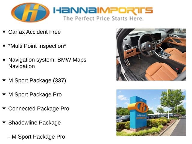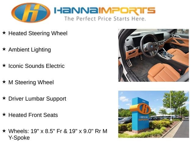 Why shop with Hanna Imports? We specialize in hand-selecting top-quality used cars, trucks, and SUVs for drivers across Raleigh, Durham, Cary, Chapel Hill, and the greater Triangle area of North Carolina. Our massive selection of 1,000+ vehicles on our Raleigh lot is carefully curated to include the most sought-after models, all priced below market value. We believe in transparency and efficiency—our vehicles are aggressively priced from the start, which means no haggling, no hassle, and no wasted time. The price you see is our absolute best price. Whether you're coming from Wake Forest, Apex, Garner, or anywhere in central NC, we’re committed to making your car-buying experience smooth, affordable, and enjoyable. Come see why Hanna Imports is one of the most trusted used car dealerships in North Carolina! Used BMW i4 in Raleigh. Used BMW i4 in North Carolina, Connected Package Pro, M Sport Package (Adaptive M Suspension, Aerodynamic Kit, M Steering Wheel, Shadowline Exterior Trim, Variable Sport Steering, Wheels: 19 x 8.5 Fr & 19 x 9.0 Rr M Y-Spoke, and Without Lines Designation Outside), M Sport Package (337), M Sport Package Pro, Premium Package (Ambient Lighting, Driver Lumbar Support, Heated Front Seats, Heated Steering Wheel, and Iconic Sounds Electric), Shadowline Package (Black Mirror Caps, Extended Shadowline Trim, M Shadowline Lights, and M Sport Brakes w/Red Calipers), Exterior Parking Camera Rear, Navigation system: BMW Maps Navigation, Power Liftgate, Power moonroof, 10 Speakers, 4-Wheel Disc Brakes, ABS brakes, Air Conditioning, Alloy wheels, Apple CarPlay & Android Auto Compatibility, Auto High-beam Headlights, Auto-dimming door mirrors, Auto-dimming Rear-View mirror, Auto-leveling suspension, Automatic temperature control, BMW Assist eCall, BMW Curved Display, BMW Curved Display w/HUD, BMW TeleServices, Brake assist, Bumpers: body-color, Compass, ConnectedDrive Services, Delay-off headlights, Driver door bin, Driver vanity mirror, Dual front impact airbags, Dual front side impact airbags, Electronic Stability Control, Emergency communication system: BMW Assist eCall, Four wheel independent suspension, Front anti-roll bar, Front Bucket Seats, Front Center Armrest, Front dual zone A/C, Front reading lights, Fully automatic headlights, Garage door transmitter, harman/kardon Surround Sound System, Heated door mirrors, Hi-Fi Sound System, Icon Adaptive LED Headlights w/Laserlight, Illuminated entry, Leather steering wheel, Low tire pressure warning, Memory seat, Occupant sensing airbag, Outside temperature display, Overhead airbag, Overhead console, Panic alarm, Passenger door bin, Passenger vanity mirror, Perforated Sensatec Upholstery, Personal eSIM 5G, Power door mirrors, Power driver seat, Power Front Seats, Power passenger seat, Power steering, Power windows, Radio data system, Radio: FM Audio System, Rain sensing wipers, Rear air conditioning, Rear anti-roll bar, Rear reading lights, Rear seat center armrest, Rear window defroster, Remote keyless entry, Security system, Shadowline Exterior Trim (DISC), SiriusXM Satellite Radio w/1 Year Subscription, Speed control, Speed-sensing steering, Speed-Sensitive Wipers, Split folding rear seat, Sport Seats, Sport steering wheel,