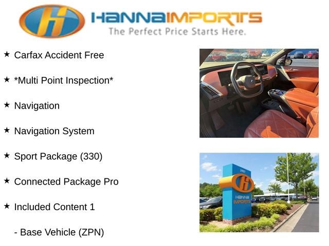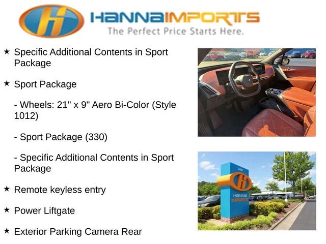 Why shop with Hanna Imports? We specialize in hand-selecting top-quality used cars, trucks, and SUVs for drivers across Raleigh, Durham, Cary, Chapel Hill, and the greater Triangle area of North Carolina. Our massive selection of 1,000+ vehicles on our Raleigh lot is carefully curated to include the most sought-after models, all priced below market value. We believe in transparency and efficiency—our vehicles are aggressively priced from the start, which means no haggling, no hassle, and no wasted time. The price you see is our absolute best price. Whether you're coming from Wake Forest, Apex, Garner, or anywhere in central NC, we’re committed to making your car-buying experience smooth, affordable, and enjoyable. Come see why Hanna Imports is one of the most trusted used car dealerships in North Carolina! Used BMW iX in Raleigh. Used BMW iX in North Carolina, Connected Package Pro, Included Content 1 (Base Vehicle (ZPN)), Specific Additional Contents in Sport Package, Sport Package (Wheels: 21 x 9 Aero Bi-Color (Style 1012)), Sport Package (330), iX xDrive50, AWD, Exterior Parking Camera Rear, Icon Adaptive LED Headlights w/Laserlight, Navigation, Navigation System, Power Liftgate, Remote keyless entry, 12 Speakers, 4-Wheel Disc Brakes, 8.77 Axle Ratio, ABS brakes, Air Conditioning, Alloy wheels, AM/FM Stereo, Apple CarPlay & Android Auto Compatibility, Apple CarPlay Compatibility, Auto High-beam Headlights, Auto tilt-away steering wheel, Auto-dimming door mirrors, Auto-dimming Rear-View mirror, Automatic temperature control, BMW Assist eCall, BMW Individual Titanium Bronze Exterior Trim, BMW TeleServices, Brake assist, Bucket Seats, Bumpers: body-color, Compass, Connected eDrive Services, ConnectedDrive Services, Delay-off headlights, Driver door bin, Driver vanity mirror, Dual front impact airbags, Dual front side impact airbags, Electronic Stability Control, Emergency communication system: BMW Assist eCall, Four wheel independent suspension, Front anti-roll bar, Front Bucket Seats, Front Center Armrest, Front dual zone A/C, Front reading lights, Fully automatic headlights, Garage door transmitter, Heated door mirrors, Heated Front Seats, Heated front seats, Hi-Fi Sound System, Illuminated entry, Leather steering wheel, Low tire pressure warning, Memory seat, Multi-Functional Seats, Natural Interaction, Occupant sensing airbag, Outside temperature display, Overhead airbag, Panic alarm, Passenger door bin, Passenger vanity mirror, Perforated SensaTec Upholstery, Power door mirrors, Power driver seat, Power passenger seat, Power steering, Power windows, Radio data system, Rain sensing wipers, Rear air conditioning, Rear anti-roll bar, Rear dual zone A/C, Rear reading lights, Rear seat center armrest, Rear window defroster, Rear window wiper, Security system, SiriusXM Satellite Radio w/1 Year Subscription, Speed control, Speed-sensing steering, Speed-Sensitive Wipers, Split folding rear seat, Spoiler, Sport steering wheel, Steering wheel memory, Steering wheel mounted audio controls, Telescoping steering wheel, Tilt steering wheel, Traction control, Trip computer, Turn signal indicator mirrors, Variably intermittent wipers, Wheels: 20 x 8.5 Aero Frzn Drk Grey (Style 1002) (1GR), Wheels: 21 x 9 Aero Dark Black (Style 1011), and Wireless Device Charging.