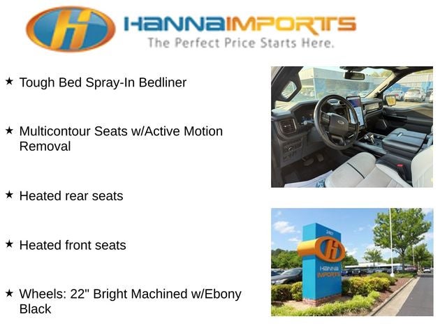Why shop with Hanna Imports? We specialize in hand-selecting top-quality used cars, trucks, and SUVs for drivers across Raleigh, Durham, Cary, Chapel Hill, and the greater Triangle area of North Carolina. Our massive selection of 1,000+ vehicles on our Raleigh lot is carefully curated to include the most sought-after models, all priced below market value. We believe in transparency and efficiency—our vehicles are aggressively priced from the start, which means no haggling, no hassle, and no wasted time. The price you see is our absolute best price. Whether you're coming from Wake Forest, Apex, Garner, or anywhere in central NC, we’re committed to making your car-buying experience smooth, affordable, and enjoyable. Come see why Hanna Imports is one of the most trusted used car dealerships in North Carolina! Used Ford F-150 Lightning in Raleigh. Used Ford F-150 Lightning in North Carolina, Equipment Group 710A Standard, F-150 Lightning Platinum, AWD, Heated front seats, Heated rear seats, Multicontour Seats w/Active Motion Removal, Navigation System, Power moonroof, Remote keyless entry, Tough Bed Spray-In Bedliner, Wheels: 22 Bright Machined w/Ebony Black, 18 Speakers, 4-Wheel Disc Brakes, ABS brakes, Adjustable pedals, Air Conditioning, Alloy wheels, Auto High-beam Headlights, Auto tilt-away steering wheel, Auto-dimming door mirrors, Auto-dimming Rear-View mirror, Automatic temperature control, Brake assist, Bumpers: body-color, Compass, Delay-off headlights, Driver door bin, Driver vanity mirror, Dual front impact airbags, Dual front side impact airbags, Electronic Stability Control, Emergency communication system: SYNC 4 911 Assist, Ford Charge Station Pro, Four wheel independent suspension, Front anti-roll bar, Front Bucket Seats, Front Center Armrest, Front dual zone A/C, Front License Plate Bracket, Front reading lights, Fully automatic headlights, Garage door transmitter, Genuine wood console insert, Genuine wood door panel insert, Heated door mirrors, Heated steering wheel, Illuminated entry, Illuminated running boards, Knee airbag, Low tire pressure warning, Memory seat, Mobile Power Cord (120/240V), Occupant sensing airbag, On-Board Scales & Smart Hitch Removal, Outside temperature display, Overhead airbag, Overhead console, Panic alarm, Passenger door bin, Passenger vanity mirror, Pedal memory, Power door mirrors, Power driver seat, Power passenger seat, Power steering, Power windows, Premium Nirvana Leather Bucket Seats, Radio data system, Radio: B&O Unleashed Sound System by Bang & Olufsen, Rain sensing wipers, Rear anti-roll bar, Rear reading lights, Rear seat center armrest, Rear step bumper, Rear window defroster, Security system, Speed control, Speed-sensing steering, Split folding rear seat, Steering Wheel Heat Removal (DISC), Steering wheel memory, Steering wheel mounted audio controls, SYNC 4A w/Enhanced Voice Recognition, Telescoping steering wheel, Tilt steering wheel, Traction control, Trip computer, Turn signal indicator mirrors, Variably intermittent wipers, and Ventilated front seats.