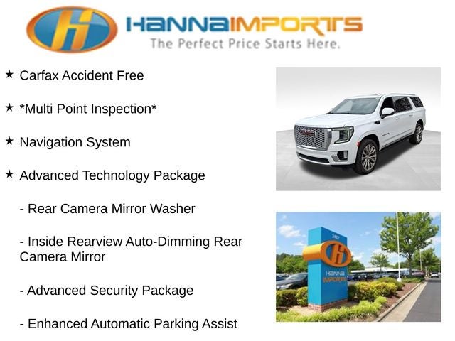 Why shop with Hanna Imports? We specialize in hand-selecting top-quality used cars, trucks, and SUVs for drivers across Raleigh, Durham, Cary, Chapel Hill, and the greater Triangle area of North Carolina. Our massive selection of 1,000+ vehicles on our Raleigh lot is carefully curated to include the most sought-after models, all priced below market value. We believe in transparency and efficiency—our vehicles are aggressively priced from the start, which means no haggling, no hassle, and no wasted time. The price you see is our absolute best price. Whether you're coming from Wake Forest, Apex, Garner, or anywhere in central NC, we’re committed to making your car-buying experience smooth, affordable, and enjoyable. Come see why Hanna Imports is one of the most trusted used car dealerships in North Carolina! Used GMC Yukon XL in Raleigh. Used GMC Yukon XL in North Carolina, Advanced Security Package (Glass Breakage Sensor, Theft-Deterrent Alarm System, Vehicle Inclination Sensor, and Vehicle Interior Movement Sensor), Advanced Technology Package (Enhanced Automatic Parking Assist, Inside Rearview Auto-Dimming Rear Camera Mirror, Rear Camera Mirror Washer, Reverse Automatic Braking, and Super Cruise), Max Trailering Package, Premium Capability Package w/Active Response 4WD (Air Ride Adaptive Suspension and Electronic Limited Slip Differential (eLSD)), License Plate Front Mounting Package, 4WD, 15 Diagonal Multi-Color Head-Up Display, Adaptive Cruise Control, Adaptive suspension, Heated Steering Wheel, Heated steering wheel, Lane Keep Assist w/Lane Departure Warning, Navigation System, 2 Presets For Outside Rearview Mirrors, 3 Years of GMC Connected Services, 3 Years of OnStar Safety & Security, 3.23 Rear Axle Ratio, 3rd Row 60/40 Power-Folding Split-Bench Seat, 3rd row seats: split-bench, 4-Wheel Disc Brakes, ABS brakes, Air Conditioning, Alloy wheels, AM/FM radio: SiriusXM with 360L, AM/FM Stereo, Apple CarPlay/Android Auto, Auto High-beam Headlights, Auto-dimming door mirrors, Auto-dimming Rear-View mirror, Auto-leveling suspension, Automatic temperature control, Bodyside moldings, Brake assist, Bright Front & Rear Door Sill Plates, Bumpers: body-color, Chrome Door Handles w/Body-Color Strip, Compass, Delay-off headlights, Deleted 3 Years of OnStar Safety & Security, Driver door bin, Driver vanity mirror, Dual Exhaust System, Dual front impact airbags, Dual front side impact airbags, Dual-Pane Panoramic Power Sunroof, Electronic Stability Control, Emergency communication system: OnStar and GMC connected services capable, Enhanced Automatic Emergency Braking, Extra Capacity Cooling System, Floor Console, Four wheel independent suspension, Front anti-roll bar, Front Bucket Seats, Front Center Armrest, Front dual zone A/C, Front fog lights, Front reading lights, Fully automatic headlights, Garage door transmitter, Hands-Free Power Programmable Rear Liftgate, HD Surround Vision, Heads-Up Display, Heated & Ventilated Driver & Front Passenger Seats, Heated 2nd Row Outboard Position Seats, Heated door mirrors, Heated Driver & Front Passenger Seats, Heated front seats, Heated rear seats, Hill Descent Control, Hitch Guidance w/Hitch View, Illuminated entry, In