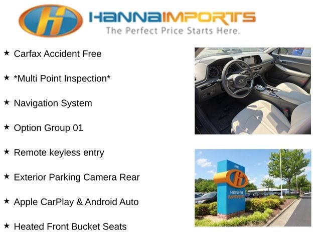 Why shop with Hanna Imports? We specialize in hand-selecting top-quality used cars, trucks, and SUVs for drivers across Raleigh, Durham, Cary, Chapel Hill, and the greater Triangle area of North Carolina. Our massive selection of 1,000+ vehicles on our Raleigh lot is carefully curated to include the most sought-after models, all priced below market value. We believe in transparency and efficiency—our vehicles are aggressively priced from the start, which means no haggling, no hassle, and no wasted time. The price you see is our absolute best price. Whether you're coming from Wake Forest, Apex, Garner, or anywhere in central NC, we’re committed to making your car-buying experience smooth, affordable, and enjoyable. Come see why Hanna Imports is one of the most trusted used car dealerships in North Carolina! Used Hyundai Sonata in Raleigh. Used Hyundai Sonata in North Carolina, Option Group 01, Gray Cloth, Apple CarPlay & Android Auto, Exterior Parking Camera Rear, Heated Front Bucket Seats, Navigation System, Remote keyless entry, 17 x 7.0J Aluminum Alloy Wheels, 4-Wheel Disc Brakes, 6 Speakers, ABS brakes, Air Conditioning, All-Season Fitted Liners, Alloy wheels, AM/FM radio: SiriusXM, Auto High-beam Headlights, Automatic temperature control, Brake assist, Bumpers: body-color, Carpeted Floor Mats, Delay-off headlights, Driver door bin, Driver vanity mirror, Dual front impact airbags, Dual front side impact airbags, Electronic Stability Control, Emergency communication system: Blue Link Connected Car Service (3-year complimentary subscription), First Aid Kit, Four wheel independent suspension, Front anti-roll bar, Front Bucket Seats, Front Center Armrest, Front dual zone A/C, Front reading lights, Fully automatic headlights, Heated door mirrors, Heated front seats, Illuminated entry, Knee airbag, Low tire pressure warning, Occupant sensing airbag, Outside temperature display, Overhead airbag, Overhead console, Panic alarm, Passenger door bin, Passenger vanity mirror, Power door mirrors, Power driver seat, Power steering, Power windows, Premium Cloth Seating Surfaces, Radio data system, Radio: AM/FM/MP3/HD/SiriusXM Display Audio w/Nav, Rear anti-roll bar, Rear seat center armrest, Rear side impact airbag, Rear window defroster, Security system, Speed control, Speed-sensing steering, Speed-Sensitive Wipers, Split folding rear seat, Steering wheel mounted audio controls, Tachometer, Telescoping steering wheel, Tilt steering wheel, Traction control, Trip computer, Turn signal indicator mirrors, and Variably intermittent wipers.