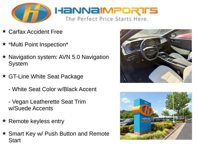 Why shop with Hanna Imports? We specialize in hand-selecting top-quality used cars, trucks, and SUVs for drivers across Raleigh, Durham, Cary, Chapel Hill, and the greater Triangle area of North Carolina. Our massive selection of 1,000+ vehicles on our Raleigh lot is carefully curated to include the most sought-after models, all priced below market value. We believe in transparency and efficiency—our vehicles are aggressively priced from the start, which means no haggling, no hassle, and no wasted time. The price you see is our absolute best price. Whether you're coming from Wake Forest, Apex, Garner, or anywhere in central NC, we’re committed to making your car-buying experience smooth, affordable, and enjoyable. Come see why Hanna Imports is one of the most trusted used car dealerships in North Carolina! Used Kia EV6 in Raleigh. Used Kia EV6 in North Carolina, GT-Line White Seat Package (Vegan Leatherette Seat Trim w/Suede Accents and White Seat Color w/Black Accent), EV6 GT-Line, Apple CarPlay & Android Auto, Heated & Ventilated Front Bucket Seats, Navigation system: AVN 5.0 Navigation System, Power Liftgate, Power moonroof, Remote keyless entry, Smart Key w/ Push Button and Remote Start, 14 Speakers, 4-Wheel Disc Brakes, ABS brakes, Air Conditioning, Alloy wheels, AM/FM radio: SiriusXM, Auto High-beam Headlights, Auto-dimming Rear-View mirror, Automatic temperature control, Axle Ratio: 10.650, Brake assist, Bumpers: body-color, Carpet Floor Mats, Delay-off headlights, Driver door bin, Driver vanity mirror, Dual front impact airbags, Dual front side impact airbags, Electronic Stability Control, Emergency communication system, Four wheel independent suspension, Front anti-roll bar, Front Bucket Seats, Front Center Armrest, Front dual zone A/C, Front reading lights, Fully automatic headlights, Garage door transmitter: HomeLink, Heads-Up Display, Heated door mirrors, Heated front seats, Illuminated entry, Knee airbag, Low tire pressure warning, Memory seat, Occupant sensing airbag, Outside temperature display, Overhead airbag, Overhead console, Panic alarm, Passenger door bin, Passenger vanity mirror, Power door mirrors, Power driver seat, Power passenger seat, Power steering, Power windows, Radio: Meridian Premium Audio System, Rain sensing wipers, Rear anti-roll bar, Rear seat center armrest, Rear window defroster, Security system, Speed control, Speed-sensing steering, Split folding rear seat, Spoiler, Sport steering wheel, Steering wheel mounted audio controls, Telescoping steering wheel, Tilt steering wheel, Traction control, Trip computer, Turn signal indicator mirrors, Variably intermittent wipers, Vegan Leather Seat Trim, Ventilated front seats, and Wheels: 7.5J x 19 Black Painted Alloy.