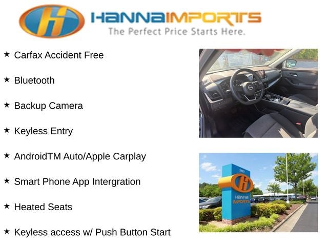Why shop with Hanna Imports? We specialize in hand-selecting top-quality used cars, trucks, and SUVs for drivers across Raleigh, Durham, Cary, Chapel Hill, and the greater Triangle area of North Carolina. Our massive selection of 1,000+ vehicles on our Raleigh lot is carefully curated to include the most sought-after models, all priced below market value. We believe in transparency and efficiency—our vehicles are aggressively priced from the start, which means no haggling, no hassle, and no wasted time. The price you see is our absolute best price. Whether you're coming from Wake Forest, Apex, Garner, or anywhere in central NC, we’re committed to making your car-buying experience smooth, affordable, and enjoyable. Come see why Hanna Imports is one of the most trusted used car dealerships in North Carolina! Used Nissan Rogue in Raleigh. Used Nissan Rogue in North Carolina, Rogue SV, 18 Aluminum Alloy Wheels, 4-Wheel Disc Brakes, 5.604 Axle Ratio, 6 Speakers, ABS brakes, Air Conditioning, Alloy wheels, AM/FM Radio, AM/FM radio: SiriusXM, Auto High-beam Headlights, Automatic temperature control, Black Splash Guards (Set of 4), Brake assist, Bumpers: body-color, Cloth Seat Trim, Delay-off headlights, Driver door bin, Driver vanity mirror, Dual front impact airbags, Dual front side impact airbags, Electronic Stability Control, Emergency communication system: NissanConnect Services, Floor Mats w/1-Piece Cargo Area Protector, Four wheel independent suspension, Front anti-roll bar, Front Bucket Seats, Front Center Armrest, Front dual zone A/C, Front reading lights, Fully automatic headlights, Heated door mirrors, Illuminated entry, Knee airbag, Low tire pressure warning, NissanConnect featuring Apple CarPlay and Android Auto, Occupant sensing airbag, Outside temperature display, Overhead airbag, Overhead console, Panic alarm, Passenger door bin, Passenger vanity mirror, Power door mirrors, Power driver seat, Power steering, Power windows, Radio data system, Rear anti-roll bar, Rear Parking Sensors, Rear seat center armrest, Rear side impact airbag, Rear window defroster, Rear window wiper, Remote keyless entry, Speed control, Speed-Sensitive Wipers, Split folding rear seat, Spoiler, Steering wheel mounted audio controls, Tachometer, Telescoping steering wheel, Tilt steering wheel, Traction control, Trip computer, and Variably intermittent wipers.