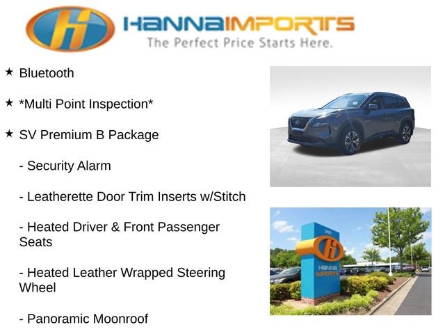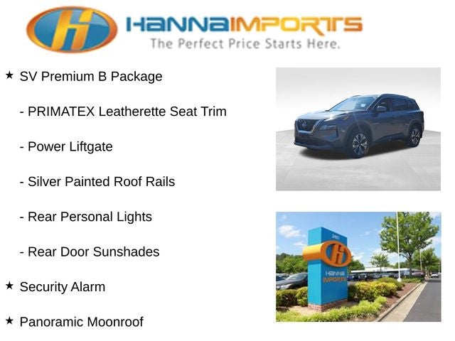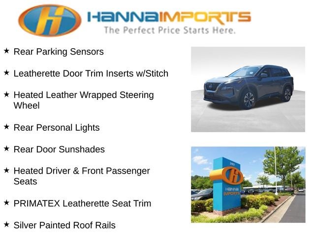Why shop with Hanna Imports? We specialize in hand-selecting top-quality used cars, trucks, and SUVs for drivers across Raleigh, Durham, Cary, Chapel Hill, and the greater Triangle area of North Carolina. Our massive selection of 1,000+ vehicles on our Raleigh lot is carefully curated to include the most sought-after models, all priced below market value. We believe in transparency and efficiency—our vehicles are aggressively priced from the start, which means no haggling, no hassle, and no wasted time. The price you see is our absolute best price. Whether you're coming from Wake Forest, Apex, Garner, or anywhere in central NC, we’re committed to making your car-buying experience smooth, affordable, and enjoyable. Come see why Hanna Imports is one of the most trusted used car dealerships in North Carolina! Used Nissan Rogue in Raleigh. Used Nissan Rogue in North Carolina, SV Premium B Package (Heated Driver & Front Passenger Seats, Heated Leather Wrapped Steering Wheel, Leatherette Door Trim Inserts w/Stitch, Panoramic Moonroof, Power Liftgate, PRIMATEX Leatherette Seat Trim, Rear Door Sunshades, Rear Personal Lights, Security Alarm, and Silver Painted Roof Rails), Rogue SV, AWD, Rear Parking Sensors, 18 Aluminum Alloy Wheels, 4-Wheel Disc Brakes, 5.604 Axle Ratio, 6 Speakers, ABS brakes, Air Conditioning, Alloy wheels, AM/FM Radio, AM/FM radio: SiriusXM, Auto High-beam Headlights, Automatic temperature control, Black Splash Guards (Set of 4), Brake assist, Bumpers: body-color, Chrome Rear Bumper Protector, Cloth Seat Trim, Delay-off headlights, Driver door bin, Driver vanity mirror, Dual front impact airbags, Dual front side impact airbags, Electronic Stability Control, Emergency communication system: NissanConnect Services, First Aid Kit, Floor Mats w/1-Piece Cargo Area Protector, Four wheel independent suspension, Front anti-roll bar, Front Bucket Seats, Front Center Armrest, Front dual zone A/C, Front reading lights, Fully automatic headlights, Heated door mirrors, Illuminated entry, Knee airbag, Low tire pressure warning, NissanConnect featuring Apple CarPlay and Android Auto, Occupant sensing airbag, Outside temperature display, Overhead airbag, Overhead console, Panic alarm, Passenger door bin, Passenger vanity mirror, Power door mirrors, Power driver seat, Power steering, Power windows, Radio data system, Rear anti-roll bar, Rear seat center armrest, Rear side impact airbag, Rear window defroster, Rear window wiper, Remote keyless entry, Speed control, Speed-Sensitive Wipers, Split folding rear seat, Spoiler, Steering wheel mounted audio controls, Tachometer, Telescoping steering wheel, Tilt steering wheel, Traction control, Trip computer, and Variably intermittent wipers.
