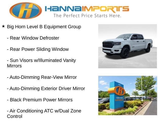 Why shop with Hanna Imports? We specialize in hand-selecting top-quality used cars, trucks, and SUVs for drivers across Raleigh, Durham, Cary, Chapel Hill, and the greater Triangle area of North Carolina. Our massive selection of 1,000+ vehicles on our Raleigh lot is carefully curated to include the most sought-after models, all priced below market value. We believe in transparency and efficiency—our vehicles are aggressively priced from the start, which means no haggling, no hassle, and no wasted time. The price you see is our absolute best price. Whether you're coming from Wake Forest, Apex, Garner, or anywhere in central NC, we’re committed to making your car-buying experience smooth, affordable, and enjoyable. Come see why Hanna Imports is one of the most trusted used car dealerships in North Carolina! Used Ram 1500 in Raleigh. Used Ram 1500 in North Carolina, Big Horn Level B Equipment Group (115V Auxiliary Power Outlet, 2nd Row In Floor Storage Bins, 400W Inverter, 9 Amplified Speakers w/Subwoofer, Air Conditioning ATC w/Dual Zone Control, Auto-Dimming Exterior Driver Mirror, Auto-Dimming Rear-View Mirror, Black Exterior Mirrors, Black Premium Power Mirrors, Class IV Receiver Hitch, Cluster 7.0 TFT Color Display, Convex Wide-Angle Exterior Mirror Insert, Exterior Mirrors Courtesy Lamps, Exterior Mirrors w/Heating Element, Exterior Mirrors w/Supplemental Signals, Front Fog Lamps, Global Telematics Box Module (TBM), Glove Box Lamp, GPS Navigation, Heated Front Seats, Heated Steering Wheel, LED Footwell Lighting, Media Hub w/2 Charge Only USBs, ParkSense Front/Rear Park Assist w/Stop, Power 2-Way Driver Lumbar Adjust, Power 8-Way Driver Seat, Power Adjustable Pedals, Power-Folding Mirrors, Radio: Uconnect 5 Nav w/12.0 Display, Rear Dome w/On/Off Switch Lamp, Rear Power Sliding Window, Rear Window Defroster, Remote Start System, Security Alarm, SiriusXM Radio