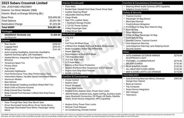 Why shop with Hanna Imports? We specialize in hand-selecting top-quality used cars, trucks, and SUVs for drivers across Raleigh, Durham, Cary, Chapel Hill, and the greater Triangle area of North Carolina. Our massive selection of 1,000+ vehicles on our Raleigh lot is carefully curated to include the most sought-after models, all priced below market value. We believe in transparency and efficiency—our vehicles are aggressively priced from the start, which means no haggling, no hassle, and no wasted time. The price you see is our absolute best price. Whether you're coming from Wake Forest, Apex, Garner, or anywhere in central NC, we’re committed to making your car-buying experience smooth, affordable, and enjoyable. Come see why Hanna Imports is one of the most trusted used car dealerships in North Carolina! Used Subaru Crosstrek in Raleigh. Used Subaru Crosstrek in North Carolina, Moonroof Package (Power Moonroof), Crosstrek Limited, Exterior Parking Camera Rear, Remote keyless entry, 3.70 Axle Ratio, 4-Wheel Disc Brakes, 6 Speakers, ABS brakes, Aero Crossbar Set, Air Conditioning, All-Weather Floor Liners, Alloy wheels, AM/FM radio: SiriusXM, Anti-whiplash front head restraints, Auto High-beam Headlights, Auto-Dimming Exterior Mirror w/Approach Light, Auto-Dimming Mirror w/Compass & HomeLink, Automatic temperature control, Brake assist, Bumpers: body-color, CD player, Driver door bin, Driver vanity mirror, Dual front impact airbags, Dual front side impact airbags, Electronic Stability Control, Emergency communication system: STARLINK Safety and Security (Subscription Required), Footwell Illumination Kit, Four wheel independent suspension, Front anti-roll bar, Front Bucket Seats, Front Center Armrest, Front fog lights, Front reading lights, Fully automatic headlights, Heated door mirrors, Heated Front Bucket Seats, Heated front seats, Illuminated entry, Knee airbag, Leather-Trimmed Upholstery, Low tire pressure warning, Map & Dome Lights LED Upgrade, Occupant sensing airbag, Outside temperature display, Overhead airbag, Overhead console, Panic alarm, Passenger door bin, Passenger vanity mirror, Power door mirrors, Power driver seat, Power steering, Power windows, Radio data system, Radio: Subaru STARLINK 8.0 Multimedia Plus System, Rear anti-roll bar, Rear Bumper Cover, Rear seat center armrest, Rear window defroster, Rear window wiper, Security system, Speed control, Speed-sensing steering, Splash Guards, Split folding rear seat, Spoiler, STARLINK/Apple CarPlay/Android Auto, Steering wheel mounted audio controls, STI Roof Spoiler, Tachometer, Telescoping steering wheel, Tilt steering wheel, Traction control, Trip computer, Turn signal indicator mirrors, Variably intermittent wipers, Wheel Locks - Alloy, and Wheels: 18 x 7.0J Alum Alloy Blk w/Machine Finish.